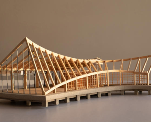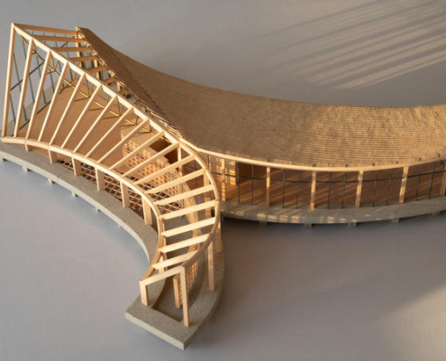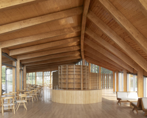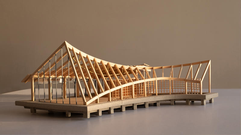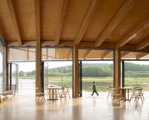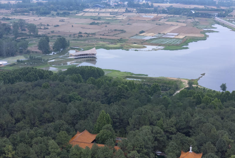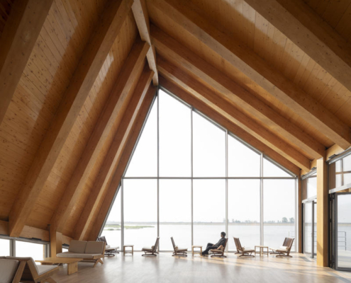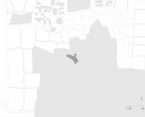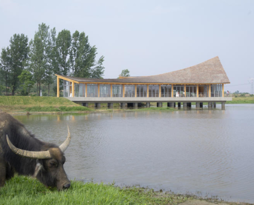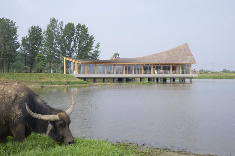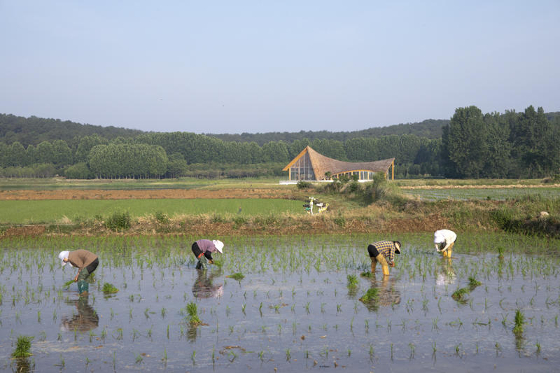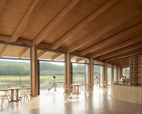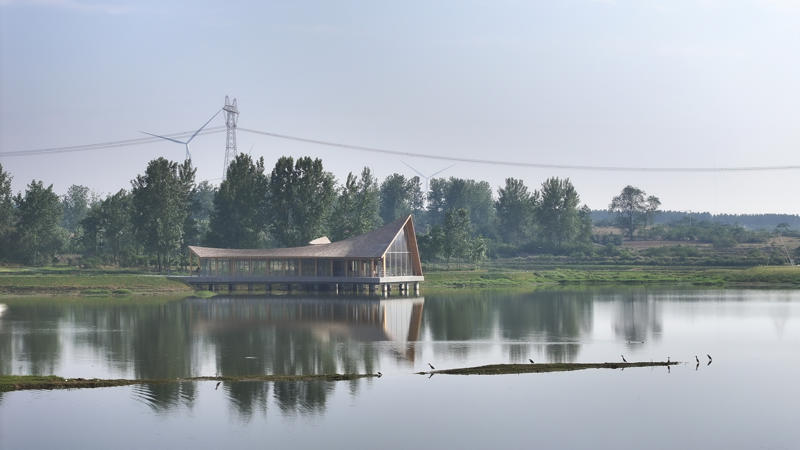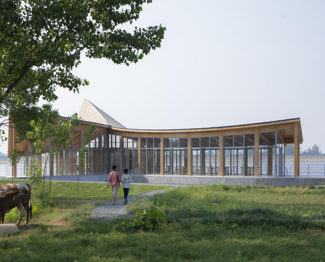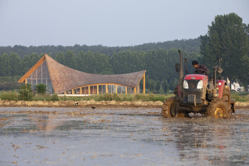 Köylüler için tarım yapmadıkları dönemlerde ortak kullanım alanı olarak tasarlanan Driftwood Köy Merkezi; çay odası, okuma salonu ve köylüler için bir toplanma alanı içeriyor. Mekansal düzenleme, tarımsal çevreye ve rezervuar su seviyelerindeki dönemsel değişimlere yanıt olarak kurgulanmış. Bina, formu aracılığıyla çevredeki dağlar ve tarım arazileriyle bir diyalog kurarak kırsal yaşam ile doğal manzara arasında bağ kuran bir aracıya dönüşmüş. Rezervuar boyunca uzanan set yolunun bir bölümü, mimari sirkülasyon için bir yönlendirici olarak seçilmiş ve böylece zemin planının her iki uçtan doğal biçimde uzanmasına olanak tanınarak yapı set yolunun organik bir devamı haline getirilmiş. Tasarım, çevreye duyarlı üretken bir mantık izliyor; yapı, orijinal set dokusuna gömülüyor. Yükseltilmiş bir platform ise su seviyelerindeki dalgalanmalara uyum sağlıyor. Yerel peyzaj, ekolojik bir tampon bölge olarak korunmuş ve yapı ile su kütlesi arasında kesintisiz bir geçiş oluşturulmuş.