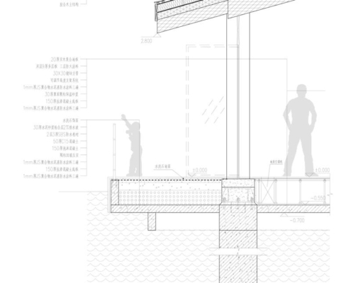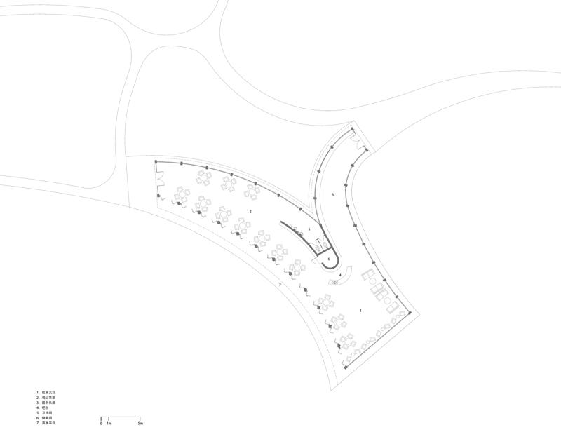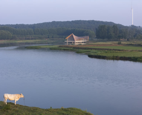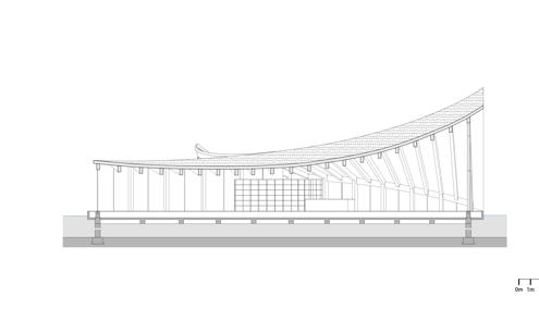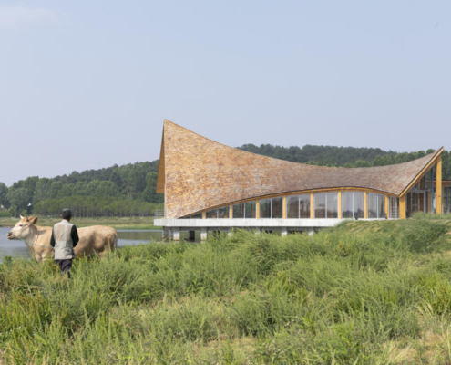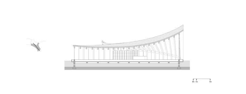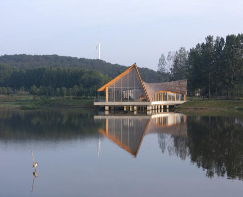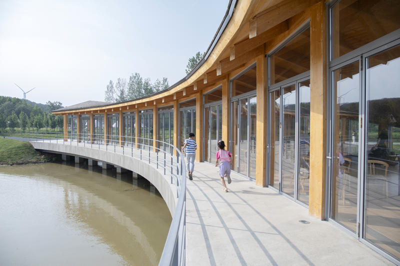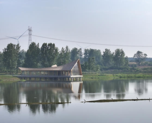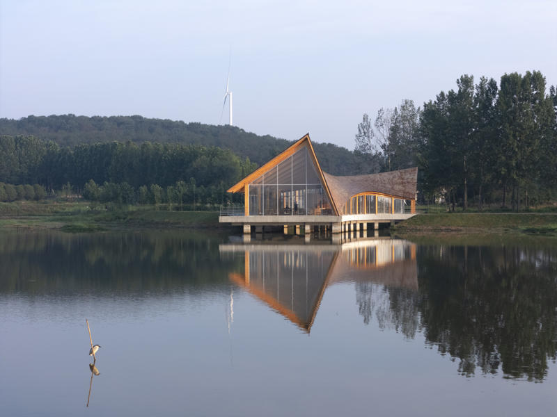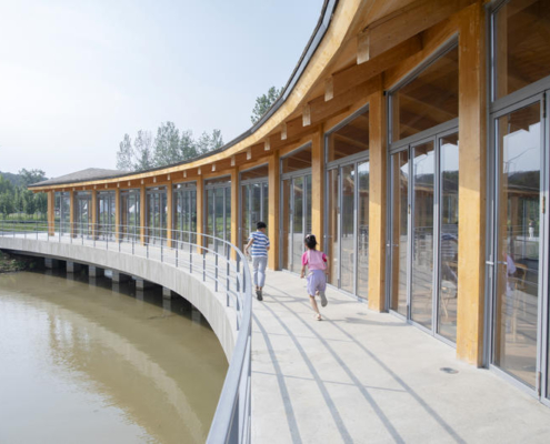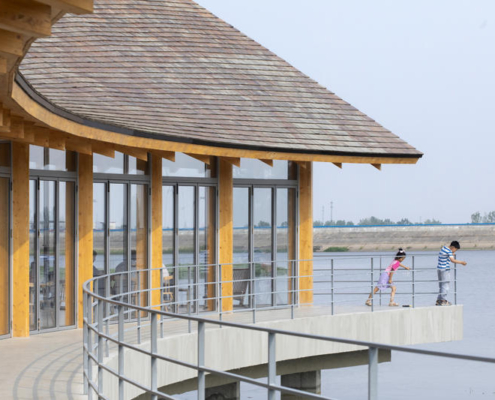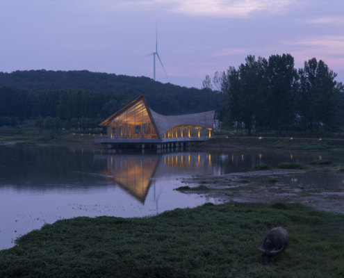 Tüm yapı bileşenleri, maliyet açısından verimli işleme ve nakliye için prefabrike elemanlar seçilmiş ve yerinde monte edilmiş. Bu yaklaşım, inşaatın çevresel etkisini önemli ölçüde azaltmış ve yapım süresini kısaltmış. Yapının her iki ucunda yer alan kavisli cepheler sırasıyla Fenghuang Dağı’na (Phoenix Mountain) ve rezervuara yönelmiş böylece açık görüş hatları sayesinde dış peyzaj iç mekana taşınmış. Girişler set yolunun her iki ucuna hizalanmış içeri girmeden önce, alçaltılmış saçaklarla örtülü bir geçiş alanından geçiliyor. Ziyaretçiler içeriye adım attıkça, iki koridor kademeli olarak yükselerek birleşiyor ve kolonsuz, tam yüksekliğe sahip bir salona açılıyor.
