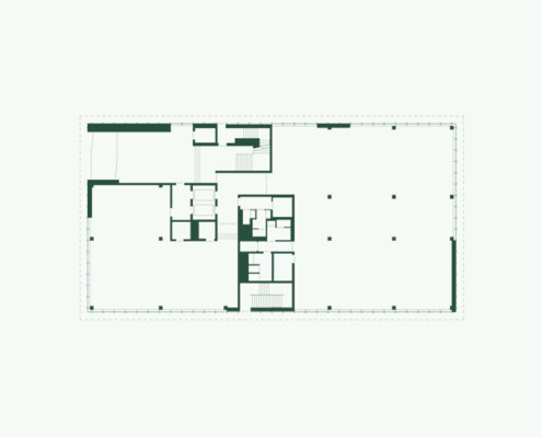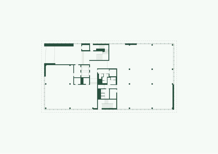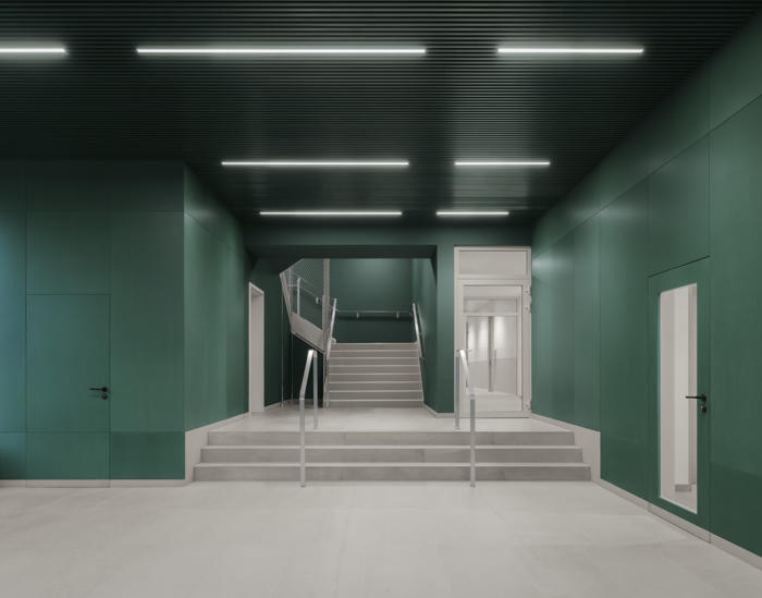 Yapı, çevresinin nötr tonları arasında öne çıkıyor. Geleneksel bir bina çekirdeğinin ögeleri ayrıştırılarak, kat planı boyunca görsel bağlantıyı artıran iki panoramik “çatı katı”na (loft) yer veriliyor; böylece klasik hücreler dizisi yerine daha açık ve akışkan bir mekan sunuluyor. Merdivenler, ön planda konumlanan, doğal ışıkla dolan ve dış manzaralar sunan canlı alanlara dönüşmüş. Dikey dolaşım, kullanıcıları harekete teşvik eden, deneyimsel bir sürece evriliyor.