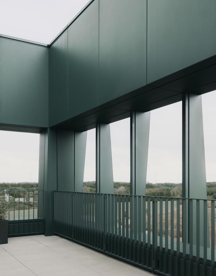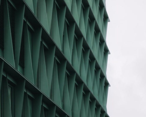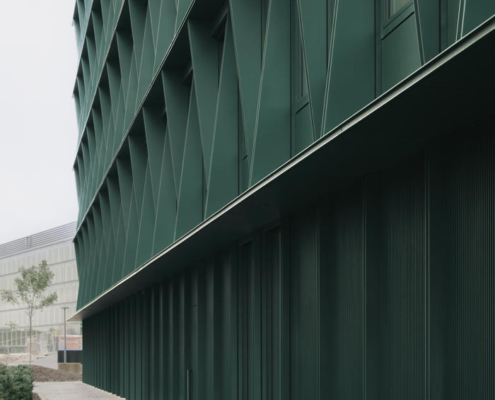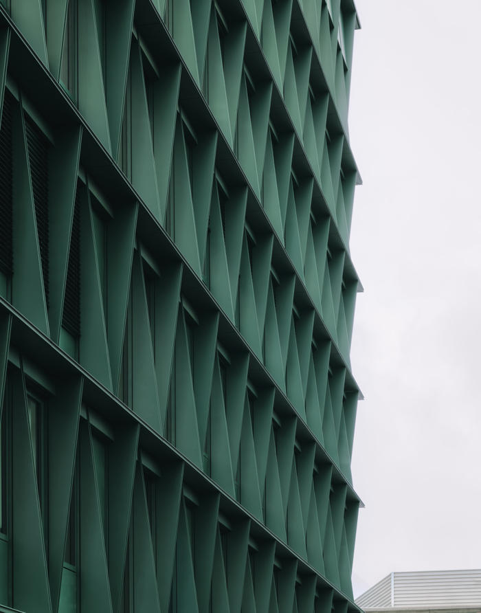 Cephedeki şerit pencereler, dönüşümlü açılı kanatlarla çerçevelenmiş. Bu kanatlar, cepheye dokulu ve üç boyutlu bir yüzey kazandırıyor. Belirli açılardan bakıldığında cephe, derin bir dokuma perdeyi andırıyor. “British Racing Green” olarak adlandırılan yüzey kaplaması, gün ışığına bağlı olarak koyu griden parlak zümrüte kadar farklı tonlara bürünüyor ve gün boyunca değişim gösteriyor.