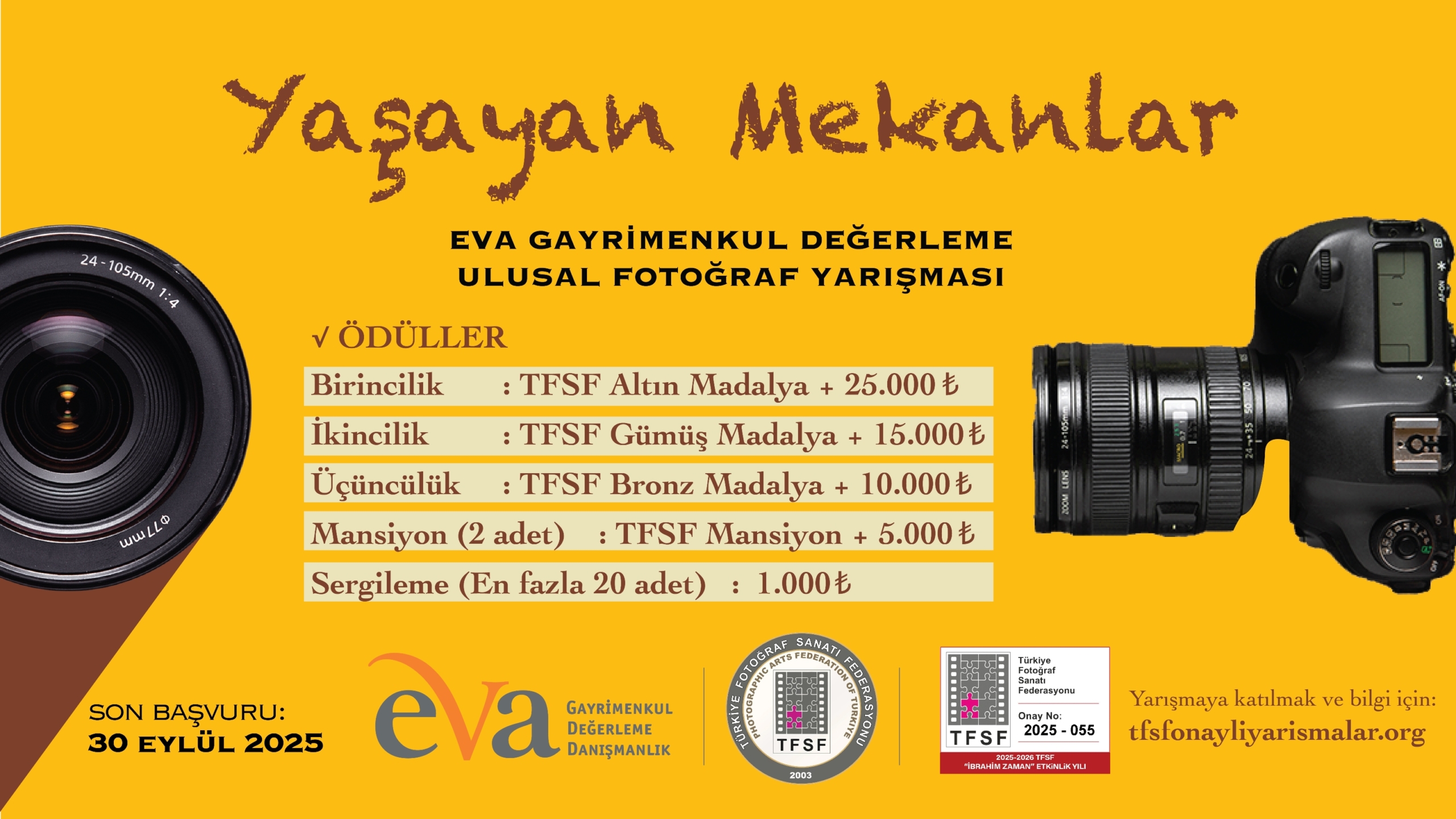 EVA Gayrimenkul Değerleme, Türkiye Fotoğraf Sanatı Federasyonu (TFSF) onayı ile düzenlendiği “Yaşayan Mekanlar” Ulusal Fotoğraf Yarışmasıyla fotoğraf sanatçılarını; yaşadığımız, tanıklık ettiğimiz ya da unutulmaya yüz tutmuş mekanların izini sürmeye ve “anı ölümsüzleştirmeye” davet ediyor. Yarışmada şehir sokaklarından kırsal yaşam alanlarına, terk edilmiş yapılardan yeni konutlara kadar mekânların ruhunu belgeleyen kareler ödüllendirilecek.