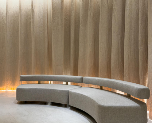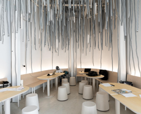 Denizin doğasının fiziksel bir his olarak deneyimlenebileceği gerçek bir yer yaratma fikri ortaya konmuş. Keşif Çağı’nda yelkenli gemilerin ana araçlarından biri olan tekne halatları kullanılmış. Rüzgar, kalınlıkları değişen sayısız halatın arasından geçerek yavaşça sallanmalarına ya da hafifçe titreşmelerine neden oluyor. Işık, çizgilerden süzülüp yansıyarak değişen bir desen yaratıyor. Bu unsurlar birlikte, dalgalar ve titreşimler tarafından şekillendirilen ve sürekli değişen bir alan olan denizin özünü çağrıştırıyor.