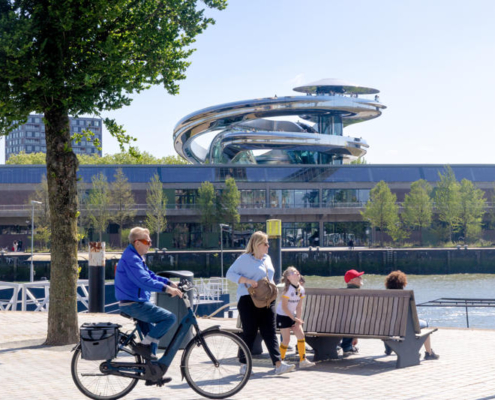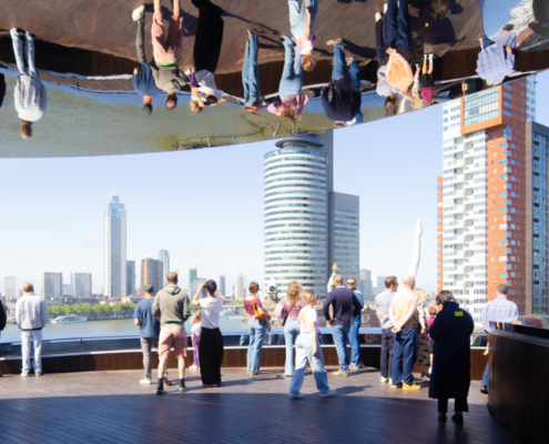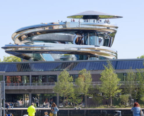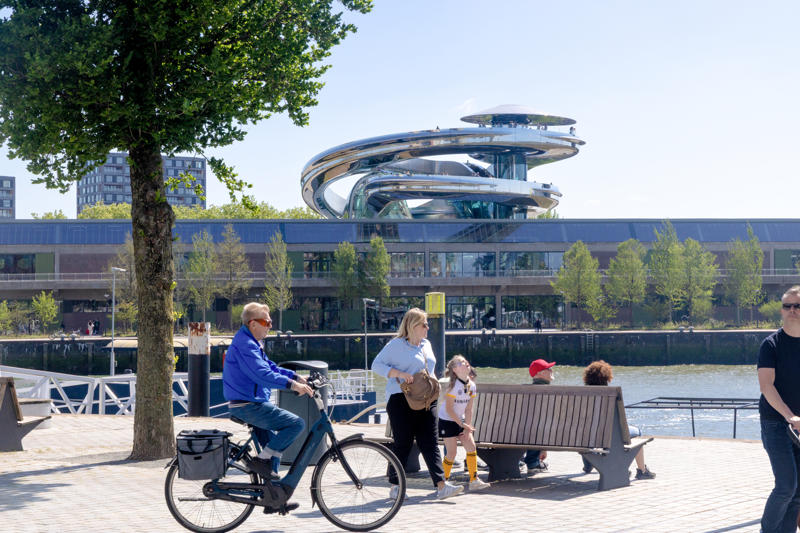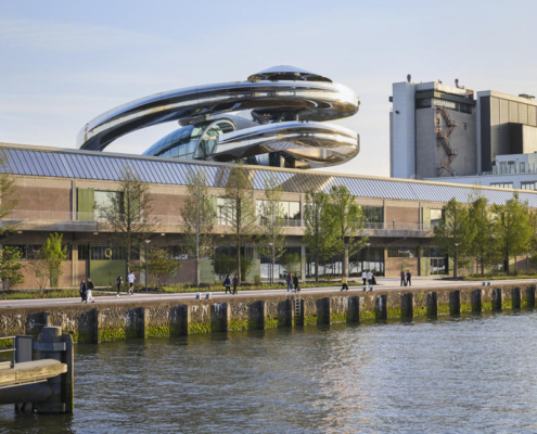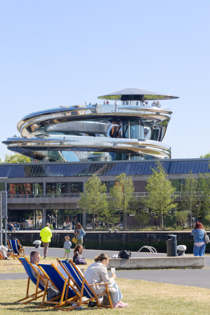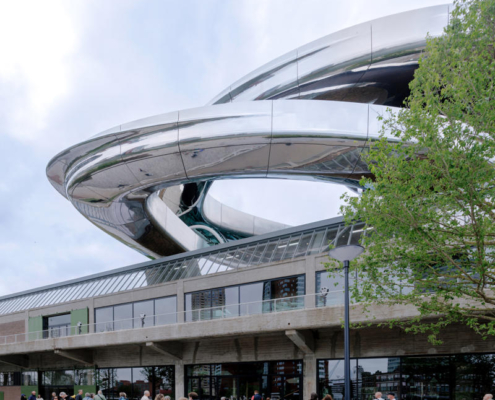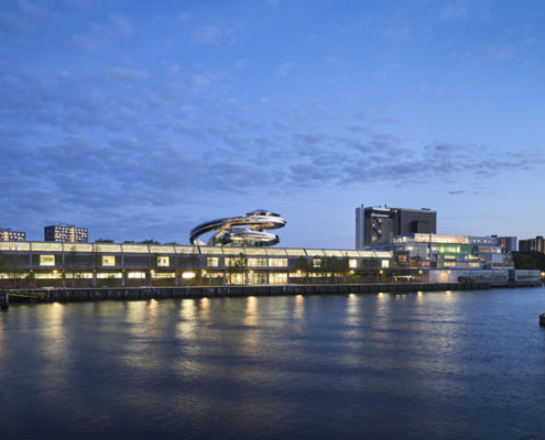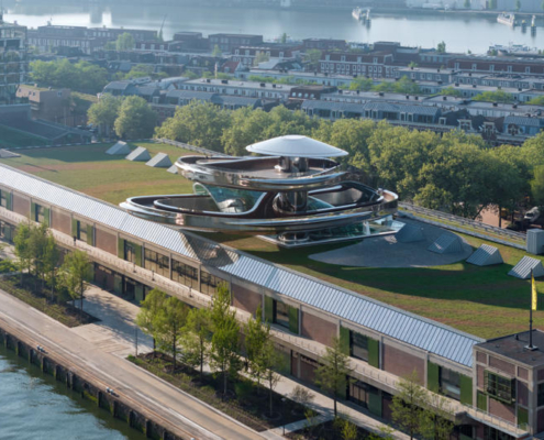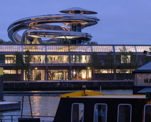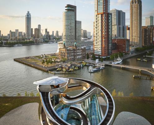 MAD, yüzyıllık depoyu geçmişle bugünü birleştiren, milyonlarca göçmenin yolculuğuna saygı duruşunda bulunan kültürel bir simge yapıya dönüştürmüş. MAD’in tasarladığı dönüşüm süreci, yapının tarihine saygı ile başlamış; Bureau Polderman tarafından restore edilen orijinal deponun sağlam strüktürü korunmuş. Yapının merkezindeki çatı açılarak doğal ışık girişi sağlanmış ve çekirdeğe dramatik bir ifadeye sahip olan tornado (hortum) formunda spiral merdiven yerleştirilmiş. Bu merdivenler, kimi zaman kesişerek kimi zaman ayrışarak bir taşıyıcı sistem oluşturuyor. Çatıdaki seyir terasına çıkan rota, bir yolculuğu simgeliyor; bu yol boyunca insanlar başkalarıyla karşılaşıyorlar, kendilerini sorguluyorlar ve her kesişimde seçimler yapıyorlar. Nihayetinde ziyaretçiler, Rotterdam ve nehir kıyısını gören en yüksek noktada buluşuyorlar. 550 metre uzunluğa ve 30 metre yüksekliğe ulaşan bu merdiven sistemi, uzay kafes taşıyıcı sistem kullanılarak tasarlanmış ve en uzun açıklığında 17 metreye kadar dışa konsol yapıyor. Tasarım, MAD tarafından roller coaster mühendisliğinde uzmanlaşmış bir ekiple iş birliği içinde geliştirilmiş.