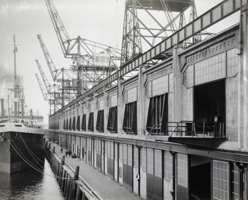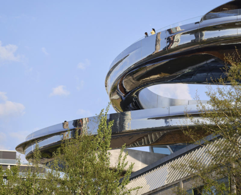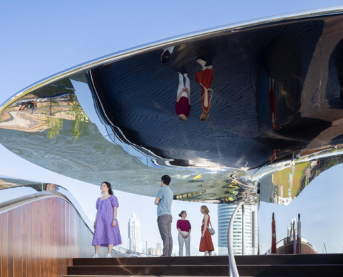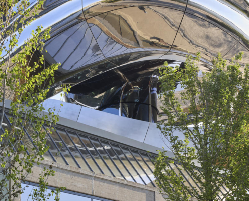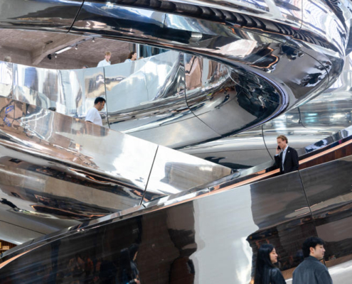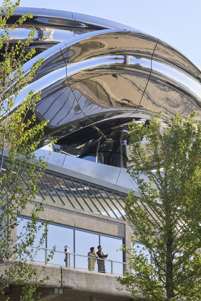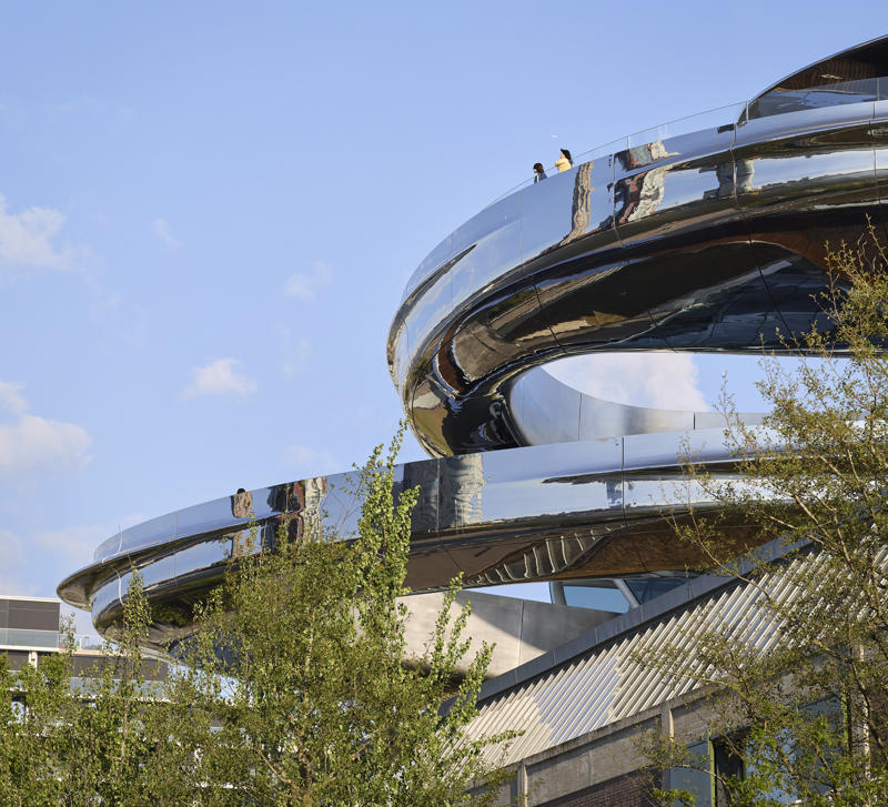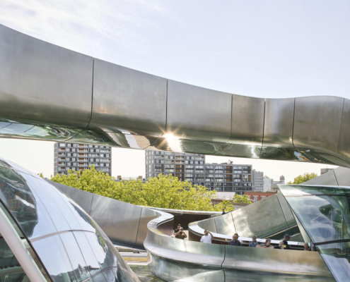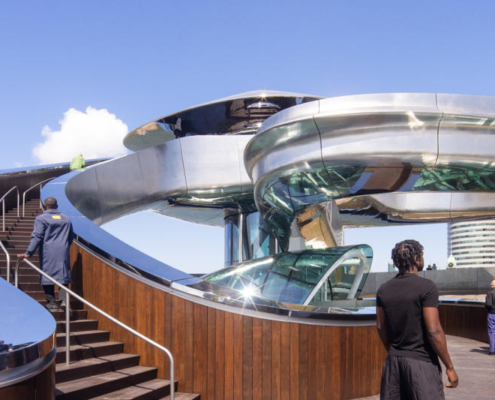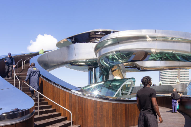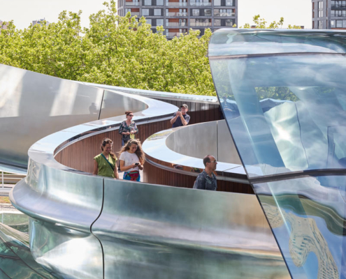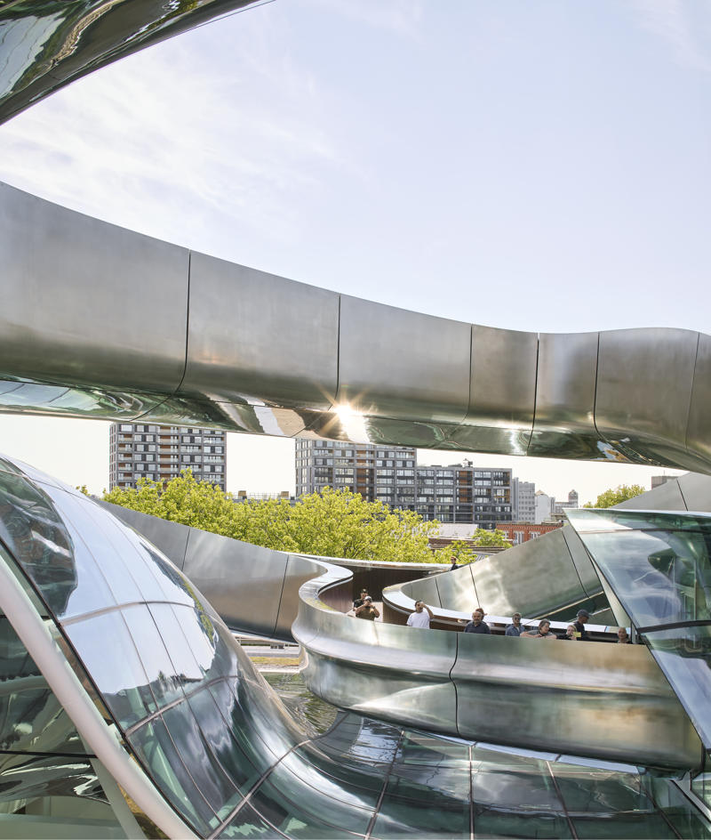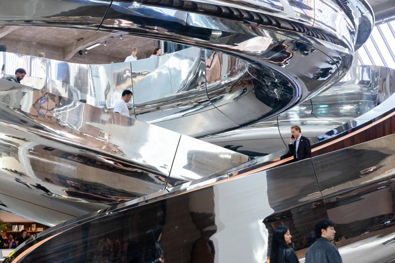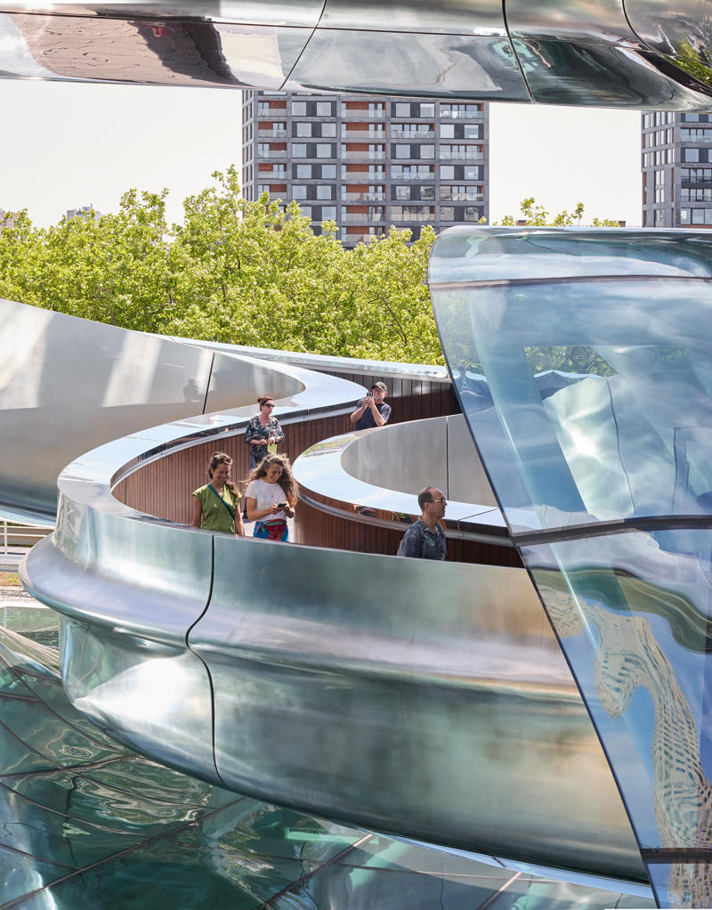 Merdivenin dış yüzeyi, CNC teknolojisiyle şekillendirilip parlatılmış gümüş renkli paslanmaz çelikle kaplanmış. Yansıtıcı yüzeyi, yoldan geçen yayaları, limandaki hareketliliği ve değişen gökyüzünü yakalayarak bu dinamik ögeleri yapının parçası haline getiriyor. Bu sayede, endüstriyel yapıya hareket ve insan varlığı da katılıyor.