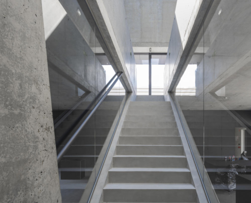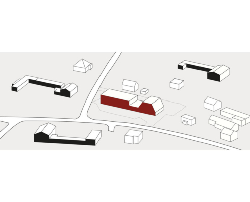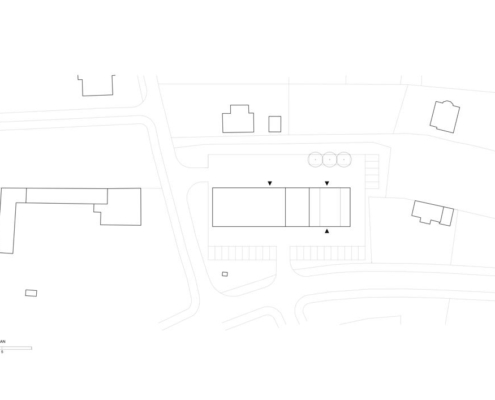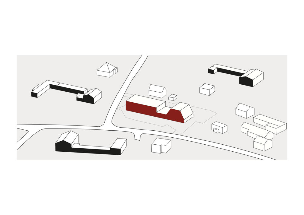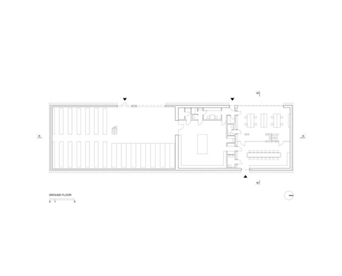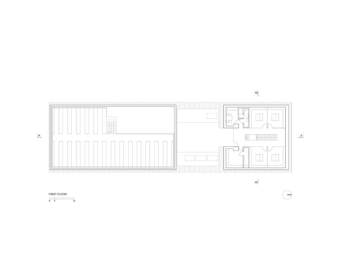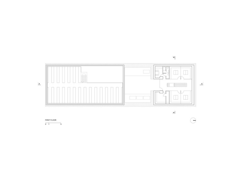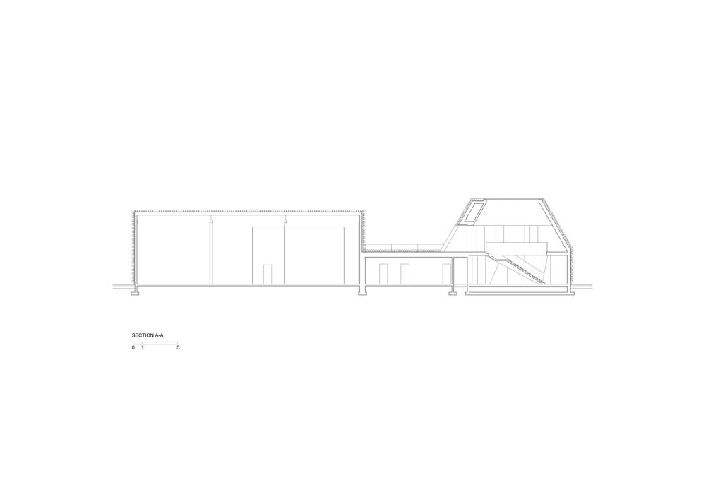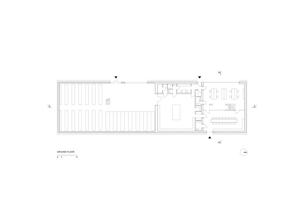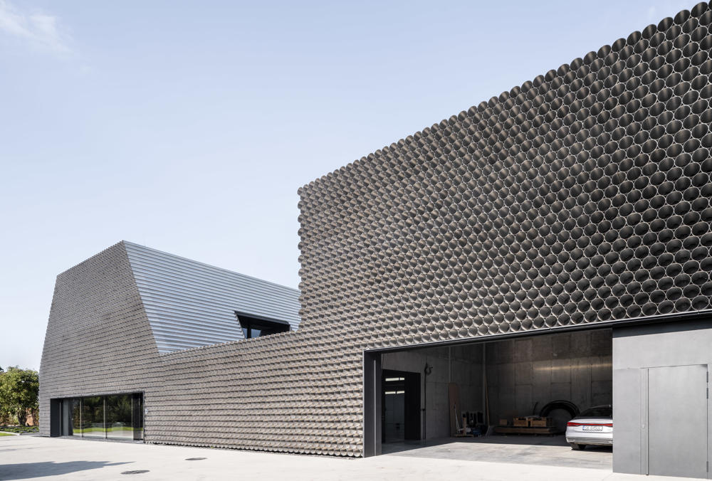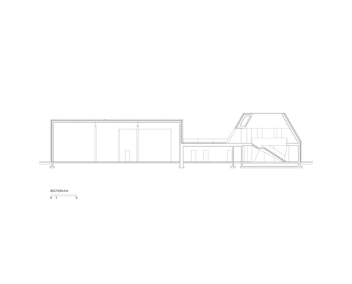 Eğimli duvarlara sahip olan iki katlı bölümde ofisler yer alıyor, daha alçak olan bölüm atölye olarak hizmet veriyor. Yüksekte yer alan kübik hatlara sahip bölüm ise ısıtma ihtiyacı olmayan bir depo alanı barındırıyor. Boruların yerleştirilme düzeni, çatının eğitimini ve binanın şeklini tanımlıyor. Eğimli çatının devam ettiği ofis bölümü, yerel imar düzenine uygun olarak yükseklik sınırına uymak için ve gereksiz hacimler üretmemek için ikinci katta kesilmiş. Yapı, caddeden bakıldığında tanımlı bir cepheye sahipken, konut bölgesinden bakıldığında parçalı hacimleri ile bağlam içerisinde kendisine yer buluyor.