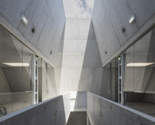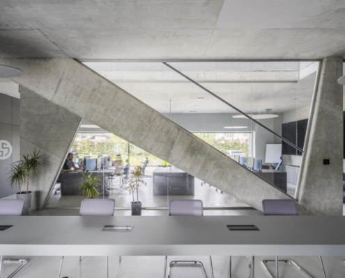 İç mekanlar geleneksel pencereler ve çatıda yer alan ışıklıklar ile aydınlatılmış. Düzenli kullanım için tasarlanan zemin kattaki ofisler park alanından oyularak elde edilen küçük bahçelere bakıyor. Tamamen endüstriyel bir işleve hizmet eden bina, öncelikle otomobil ve kamyonlar için park yerleri ile çevrilmiş. Çalışanlar için en alt kotta yer alan çatının yüzeyi bir dinlenme terası olarak tasarlanmış.