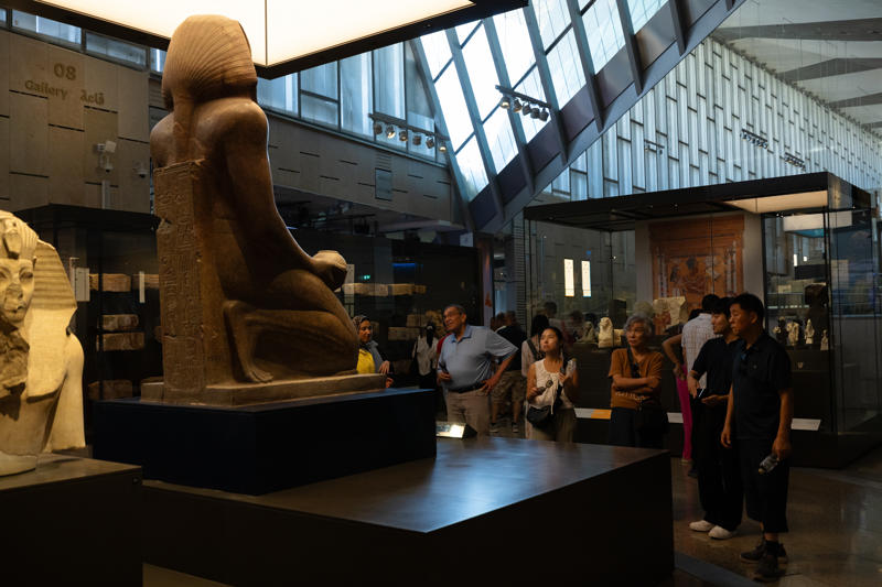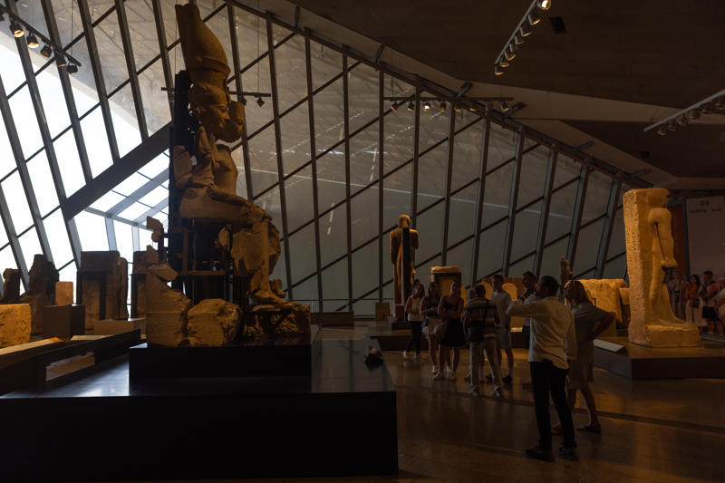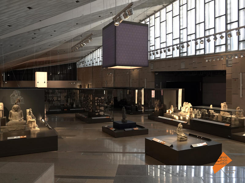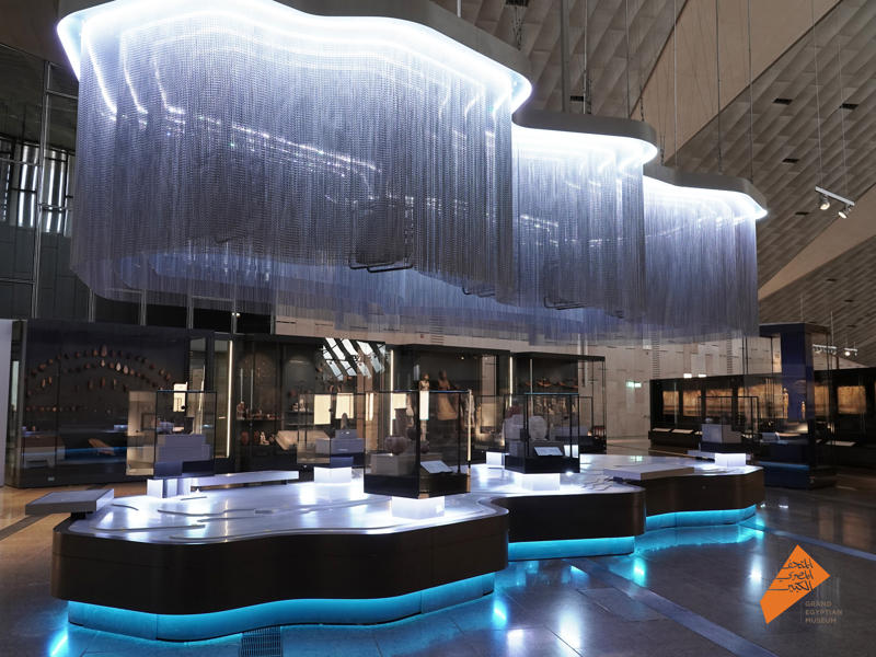 Altı katlı büyük merdiven, ziyaretçileri kronolojik olarak Mısır tarihinin farklı dönemlerinden geçirerek yönlendiriyor: Predinastik Dönem’den Kıpti Dönemi’ne kadar. Tutankhamun Galerisi’nin de yer aldığı kalıcı sergiler bu merdivenin en üst noktasında bulunuyor. Bu rota, ziyaretçilerin yolculuğunu piramitlere bakan manzara noktasında sonlandırıyor. Merdiven boyunca yerleştirilen devasa Senusret I heykelleri, tarihsel sürekliliği fiziksel biçimde görünür kılıyor.