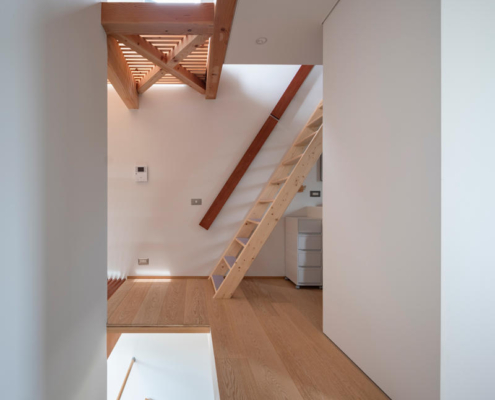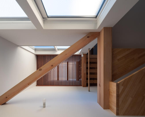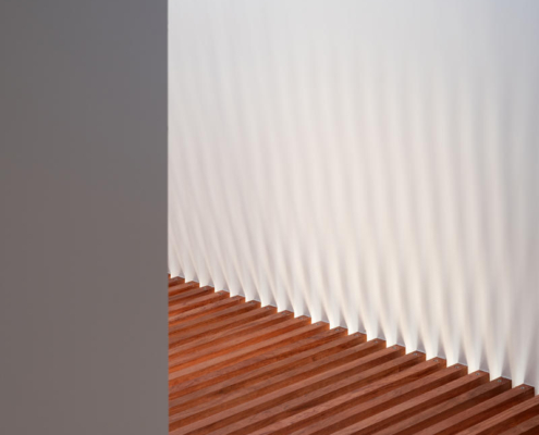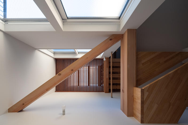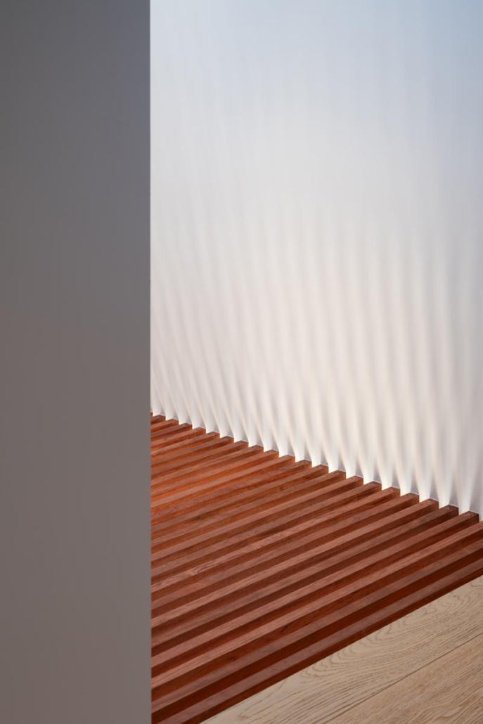 Güney cephesindeki kule benzeri düşey boşluk, çıtalı döşemeler üzerinden gün ışığını tüm seviyelere taşıyor. Farklı yüksekliklerde ve yönlerdeki açıklıklardan içeri giren ışık, beyaz yüzeylerde yansıyarak mevsim, gün saati ve hava koşullarına göre sürekli değişen bir atmosferik etki üretiyor. Bu dinamik ışık karakteri, küçük hacimde bile ferah ve zengin bir iç mekan deneyimi sunuyor.