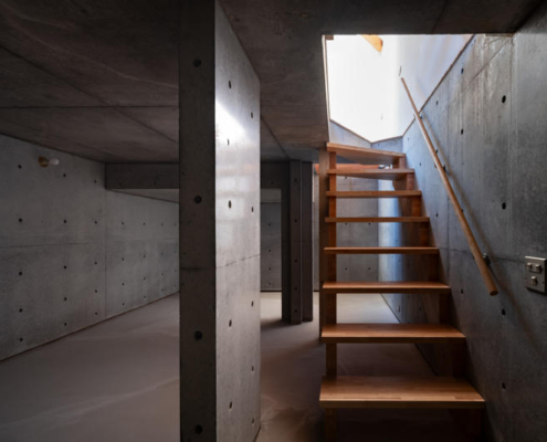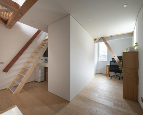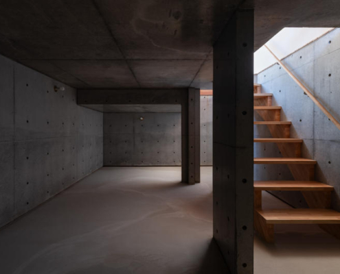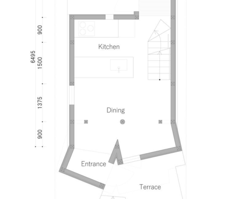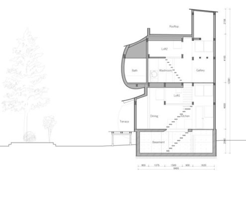 Sadece 49 m²’lik arsa alanına sahip olmasına karşın, yasal 12 metre yol genişliği, yapıda dikeyde zengin bir hacim elde edilmesine olanak tanıyor. İç mekan, üst üste binen döşeme plakaları ve iç içe geçmiş nişlerin oluşturduğu düşey bir “tek oda” olarak düşünülmüş; bu, kesintisiz ve üç boyutlu bir yaşam deneyimi üretiyor.