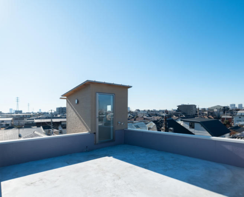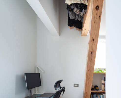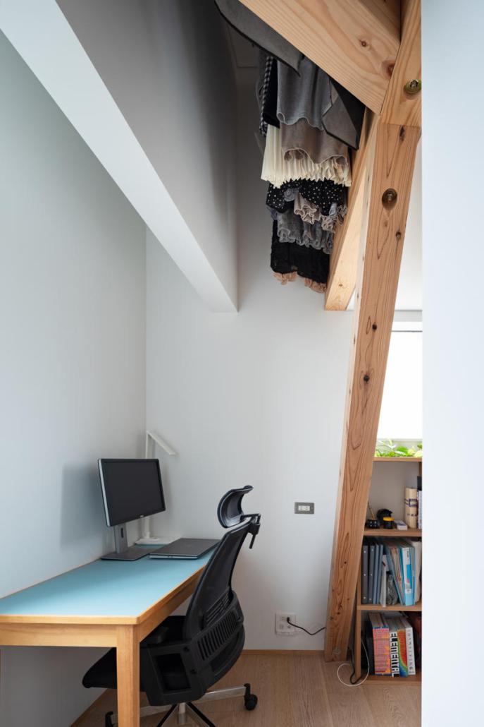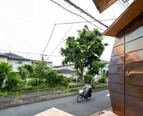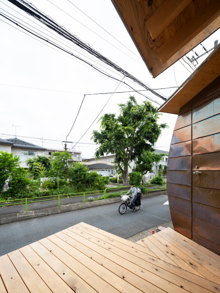 Sokak kenarındaki bitişik evlerin oluşturduğu süreklilikten farklı olarak yapı bilinçli biçimde geri çekilmiş; bu mimari hamle, kullanıcılar için teras ve küçük bir ön bahçe yaratmış. Teras gündelik tamirat ve küçük ölçekli etkinlikler için tasarlanmış, bahçe ise sakinlerin günlük rutinleri içinde bitkilerle ilgilenmesine olanak verecek ölçekte planlanmış. Bu dış mekanlar zaman içinde yeşil koridorun uzantısı olarak gelişerek mahallenin ortak peyzajına katkı sunmayı amaçlıyor. Girişte, geleneksel Japon çivileriyle sabitlenmiş bambu çiçek vazosu, mevsimsel çiçeklerin sokağa sunulmasını sağlayan bir mimari jest olarak yer alıyor.