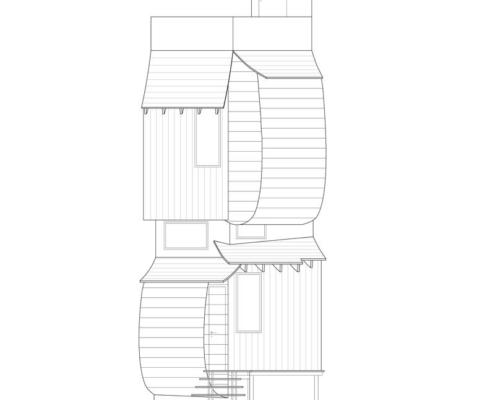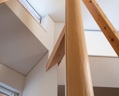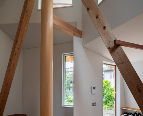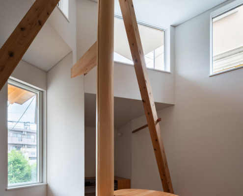 Birinci katta, dışa dönük heykelsi cephe iç mekanda yuvarlak bir ahşap sütun olarak devam ettirilmiş ve bu sütunun çevresine özel bir masa yerleştirilmiş. Yemek alanı, kuzeye bakan üst pencereden gelen yumuşak gün ışığı ile aydınlanarak sakin bir ortak mekan oluşturuyor. Banyo ve tuvalet gibi işlevler, ikinci katta toplanmış, plan şeması tuvaletin çevresinde kurgulanan dairesel akışla esnek kullanım ve gelecekte farklı işlevlere uyarlanabilirlik sağlıyor.