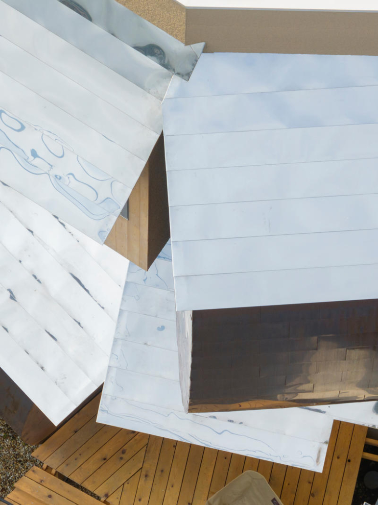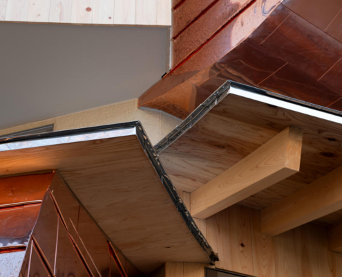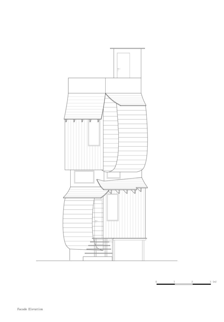 Cephe, çevredeki ağaçların eğrisel formları ve düşey ritmiyle uyumlu olarak düz ve kıvrımlı yüzeylerin birleşimiyle ele alınmış. Zaman içinde karakter kazanan bakır ve Japon selvisi (hinoki) gibi malzemeler seçilmiş. Bakır paneller geleneksel ichimonji-buki düzeninde uygulanmış, hinoki ise değişen yönlerde düşey kaplama olarak kullanılmış. Paslanmaz çelikten eğrisel çatı formu tüm kütleyi birleştiriyor. Bu malzeme kullanımı, baskın tek bir ifade yerine, dışa doğru açılan; belirsizlik, değişim ve hayal gücünü davet eden bir mimari yüzey oluşturmayı amaçlıyor.