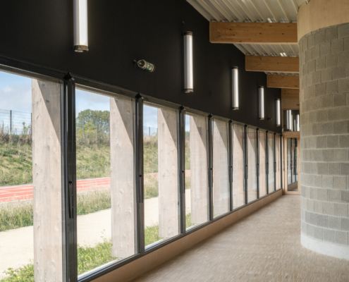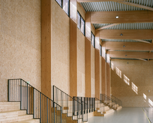 Tesisin ahşap taşıyıcı yapısı, spor salonu içinde görünür bir katman olarak vurgulanıyor. Çatı profiline göre şekillenen kirişler, tribünlerde oturan ziyaretçiler için yükseltilmiş bir salon etkisi veriyor.