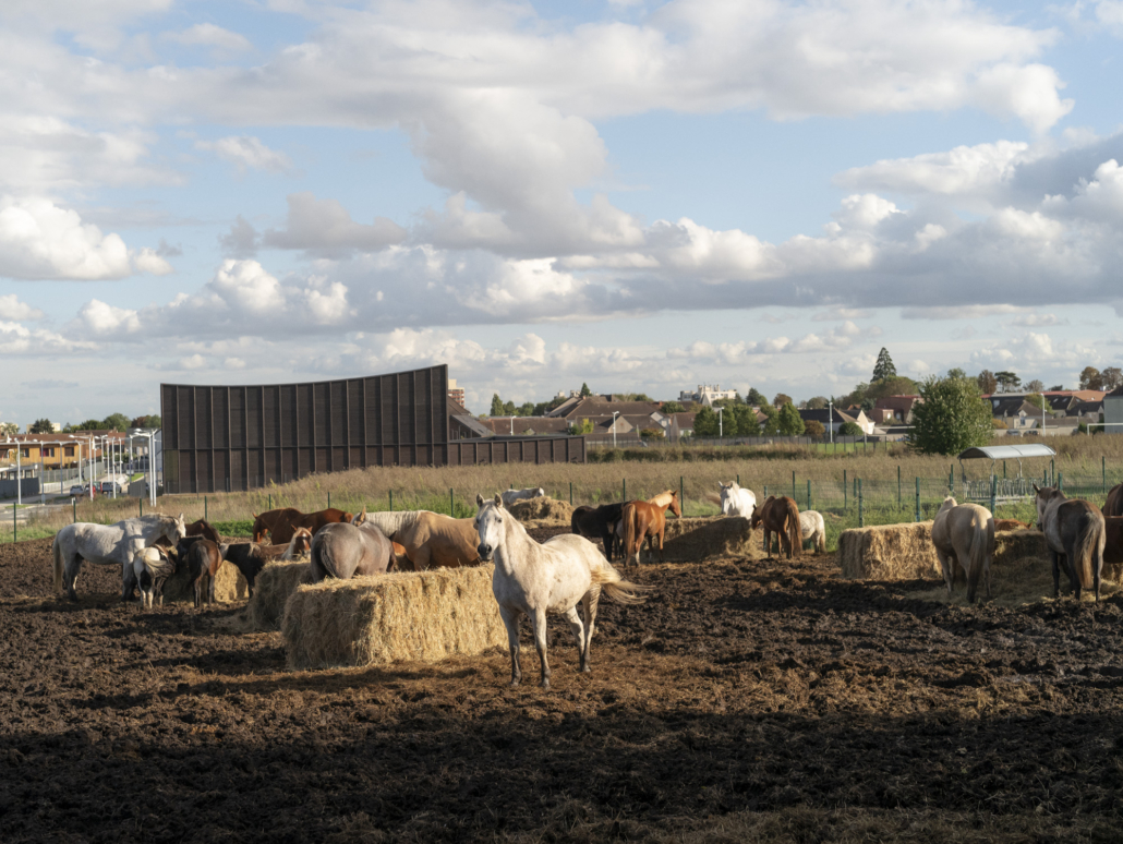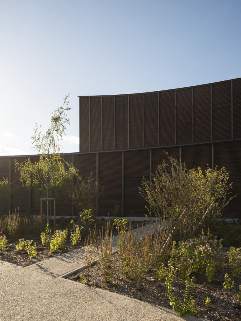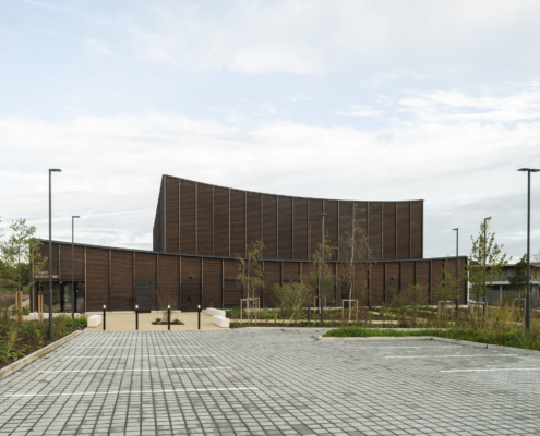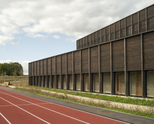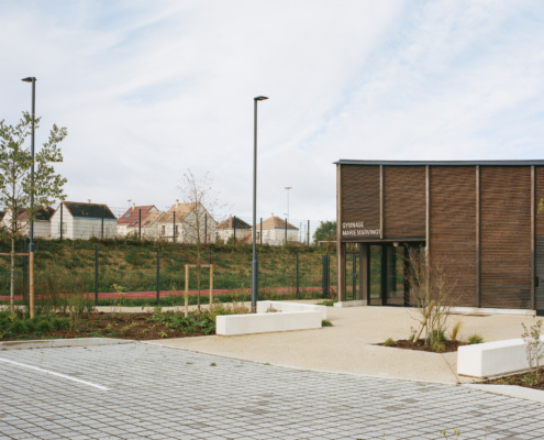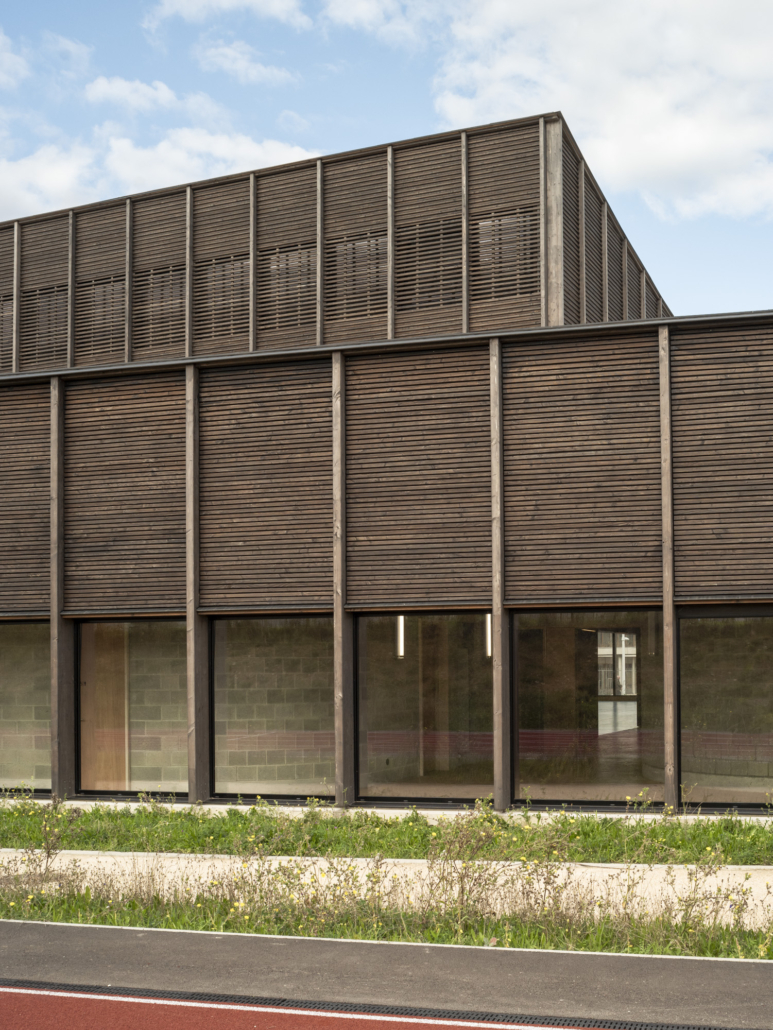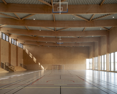 Val d’Oise bölgesindeki Le Plessis-Bouchard’da, banliyö ile tarım arazisi arasında yer alan spor salonu projesi Gymnase Marie Marvingt, karşısındaki bir ortaokul projesiyle birlikte tasarlanmış. Bölge, Paris çevresine özgü, köy ile kırsal alan arasında kalan tipik bir yapıya sahip. Yeni çok amaçlı tesis, çevresiyle büyük ölçüde açık bir ilişki kuruyor. Proje, geniş bir arazi üzerine yerleştirilmiş; bu sayede spor salonuna ek olarak koşu pisti ve uzun atlama alanı ile geniş peyzajlı bir otopark da yer alıyor.