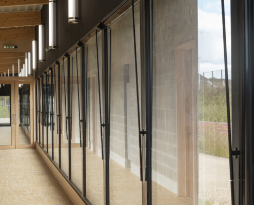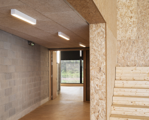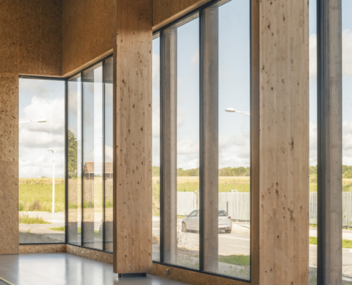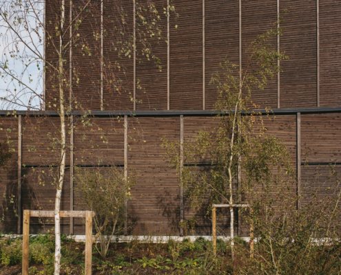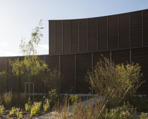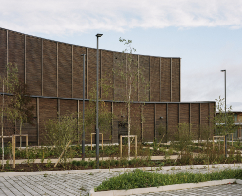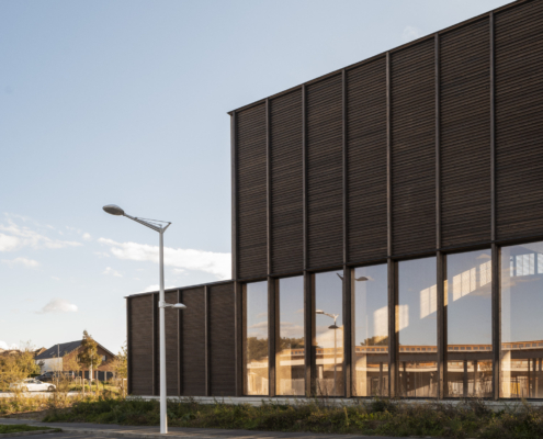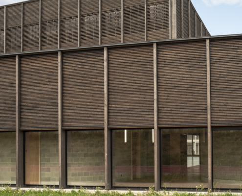 “Yüksek” ve “alçak” hacimler kaydırılarak cepheler arasında dinamik bir etkileşim sağlanmış. Bu dinamik ve ritmik görünüm, yatay ahşap kaplamalarla vurgulanmış. Alçak hacimde kaplamalar daha kalın ve sık kullanılmış; bu durum yapıya bir sağlamlık hissi kazandırıyor ve binayı zemine sabitliyor. Üst hacimdeki düzen ise gökyüzüyle bağ kuruyor.