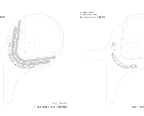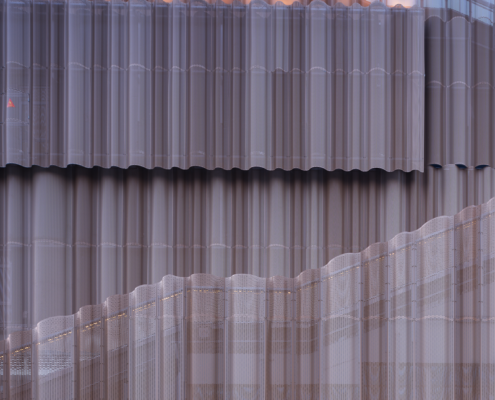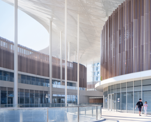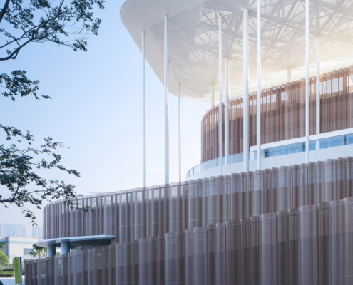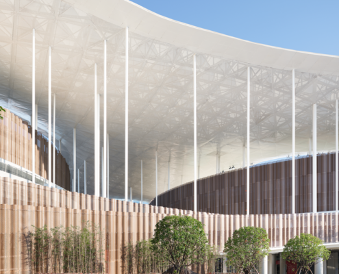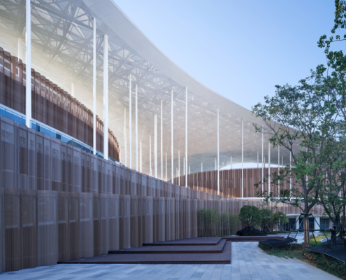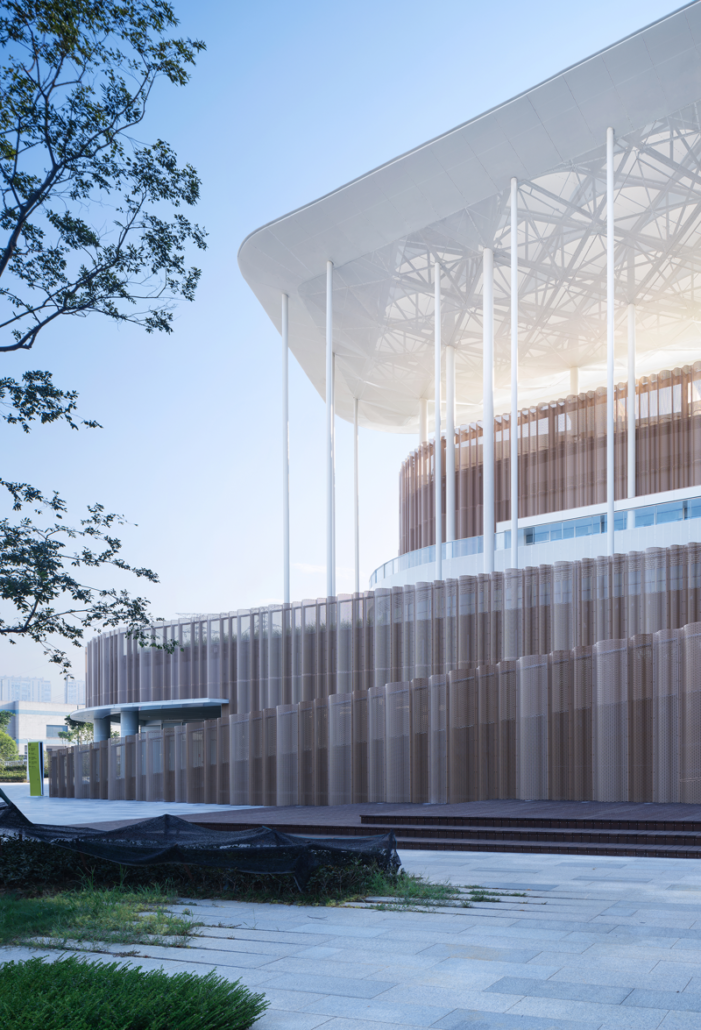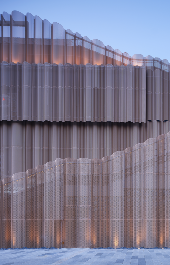 Tasarım, Shaoxing su kenti atmosferi ve tekstil kültüründen ilham alarak bölgeye özgü eşsiz bir yaklaşımı ortaya koyuyor. Sahalar, ikinci katta yer alan şerit biçimli kamusal platformla birbirine bağlanıyor ve kentin sokak ağına entegre ediliyor. Cephe tasarımında ipek kuşaklar, tomarlar ve kiremit çatı gibi geleneksel kültürel motiflerden eğrisel unsurlar alınarak, kavisli delikli alüminyum panellerle Jiangnan bölgesine özgü dalga formu betimleniyor. Farklı oran ve biçimlerdeki perforasyon desenleri, cepheye teknik bir ritim kazandırıyor; geleneksel dokuma ustalarının zanaatindeki şiirselliği sürdürüyor ve halkın bölgesel kültüre dair hafızasını canlandırıyor.