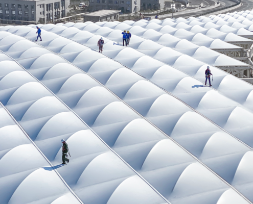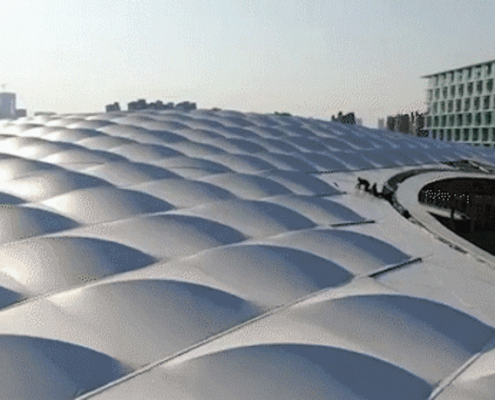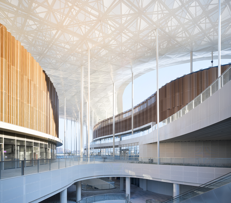Mekanın üzerinde yükselen devasa kanopi, bu tasarımın odak noktası ve zorluklarından birini oluşturuyor. UAD, maksimum 16 metre konsol açıklığına sahip çift yönlü kafes kiriş sistemi kullanarak, ince çelik kolonlarla desteklemiş. Kanopinin üst yüzeyi titanyum dioksit kaplı PTFE membranla kaplanmış; toplam 21 bin metrekarelik bir alanı örtüyor. Her bir birim ortasında hafifçe yükselerek uzaktan bakıldığında su yüzeyine vuran esintiyle oluşan dalgaları andırıyor; bu, Shaoxing su kentinin bölgesel karakterine bir gönderme oluşturuyor.