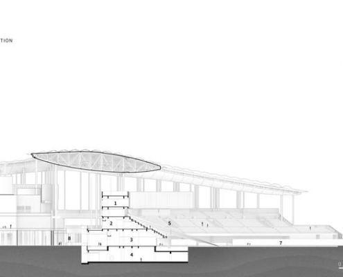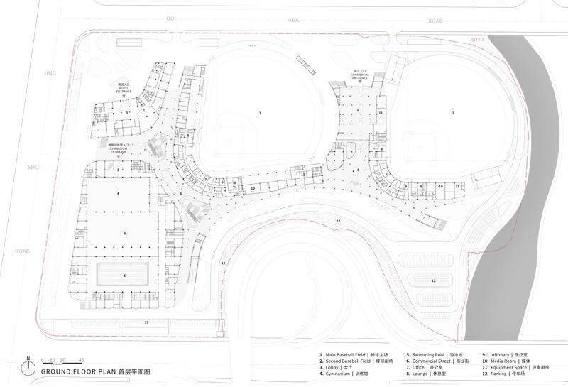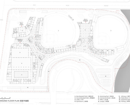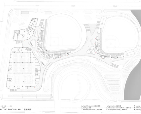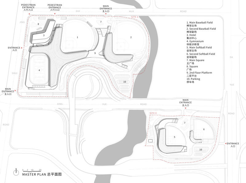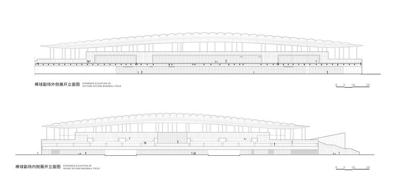 Hangzhou Asya Oyunları Beyzbol ve Softbol Spor Kültür Merkezi, Asya Oyunları’nın en büyük yeni mekanı olmanın yanı sıra, Çin’deki en büyük ölçekli, en yüksek standartlı ve en ileri donanımlı beyzbol ve softbol merkezi olma özelliğini taşıyor. Bu merkez, çevredeki alanlara yeni bir dinamizm katıyor ve sporun yerel, kültürel bir arka plan haline gelmesine katkıda bulunuyor. UAD, spor yapılarının yalnızca aktivitelere ve müsabakalara yer sağlama işlevine odaklanmaması, aynı zamanda açık, paylaşılabilir bir mekana uyum sağlayacak esnek bir kamusal hizmet işlevini de benimsemesi gerektiğine inanıyor. Beyzbol ve Softbol Spor Kültür Merkezi’ni geleneksel yaklaşımlardan ayıran önemli unsur, topluluk odaklı bir spor kültürü kompleksi olarak çevre ve bölge için bir çekim merkezi oluşturması. Geleneksel kapalı ve bağımsız mekanlardan farklı olarak tasarım, spor yapılarının nispeten kapalı ve tekil algısını kırmayı amaçlıyor; kentsel bağlamdaki çoklu olasılıkları göz önünde bulundurarak beyzbol sahası, antrenman merkezi ve kondisyon salonundan oluşan spor kültürü kompleksi ile, bulut kanat çatılı karakteristik bir ticaret sokağını bütünleştiriyor. Yaklaşık 136 bin metrekarelik toplam inşaat alanına sahip proje, A ve E olmak üzere iki parsele ayrılmış. A parselinde ana ve yan beyzbol sahaları, kondisyon salonu ve destekleyici oteller yer alırken; E parselinde ise ana ve yan softbol sahaları inşa edilmiş. Kamuya açık bir spor kültür parkı olarak tasarlanan alanda duvar bulunmuyor; ister ticaret sokağı ister farklı mekanları birbirine bağlayan ikinci kat platformu olsun, halk her an mekana girerek sıfır mesafeden alanı deneyimleyebiliyor.