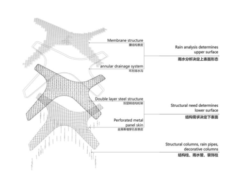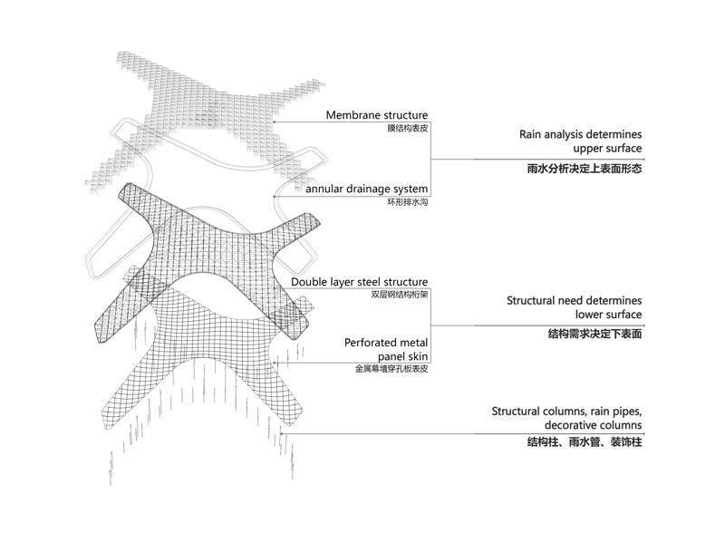 Kanopi yüzeyinin eğriliği, yağmur ve güneş simülasyonlarıyla hesaplanmış olup, ortası yüksek, kenarları alçak formda tasarlanarak en iyi drenaj ve gölgeleme performansı sağlanmış. İnce çelik kolonlardan en kalınları taşıyıcı kolonlar, diğerleri ise drenaj boruları, kablo kanalları ve dekoratif kolonlar olarak farklı işlevler üstleniyor. Farklı çaplar, üstlendikleri işlevlere işaret ediyor. Uzaktan bakıldığında tüm kanopi mekanın üzerinde süzülüyormuş gibi görünüyor; aynı zamanda tüm mekanı gölgeleyen beyaz bir bulut gibi davranıyor.