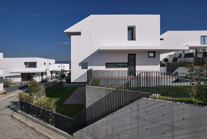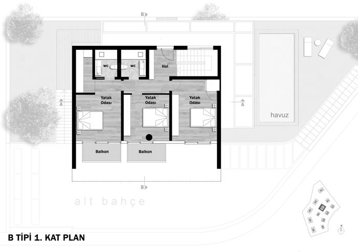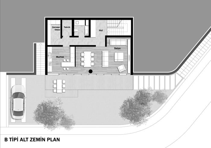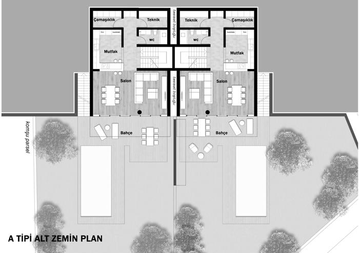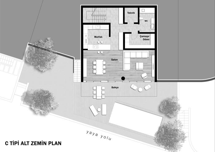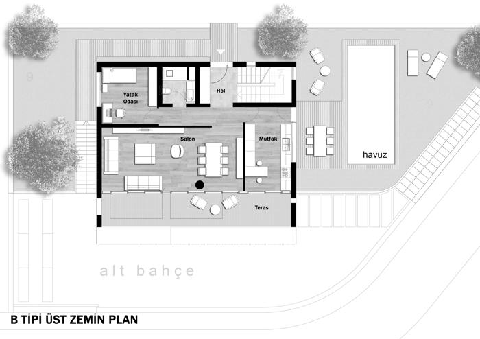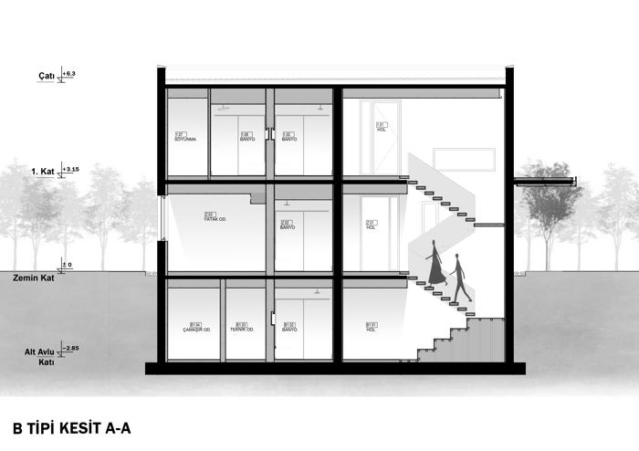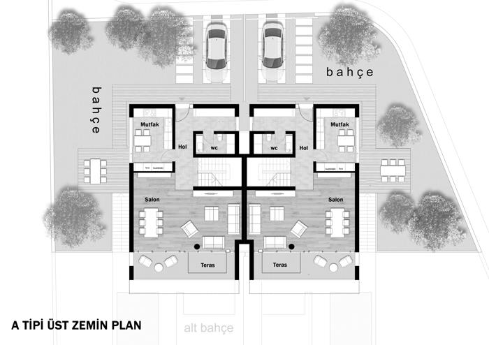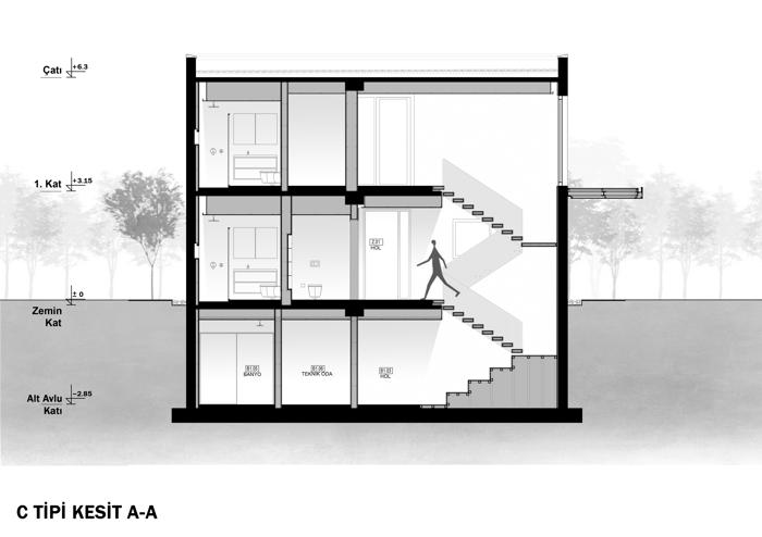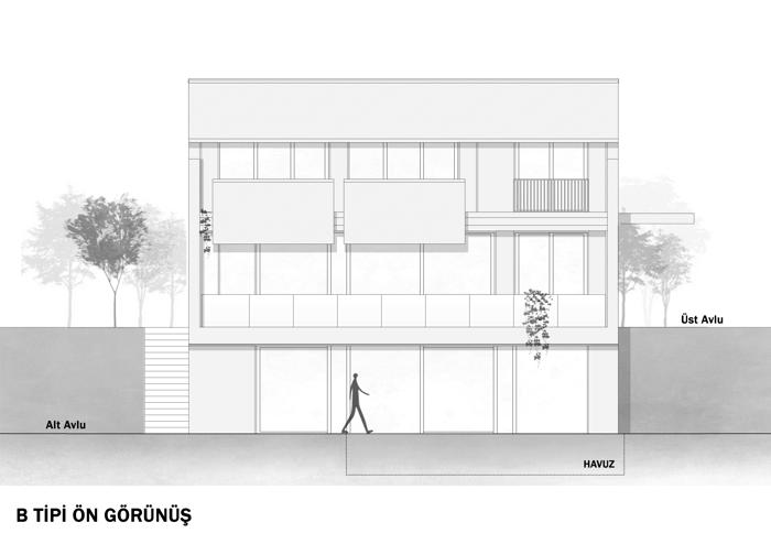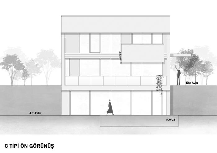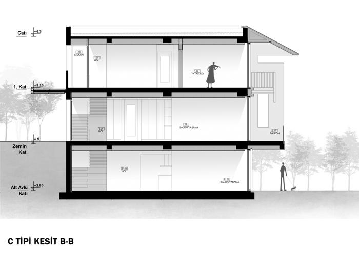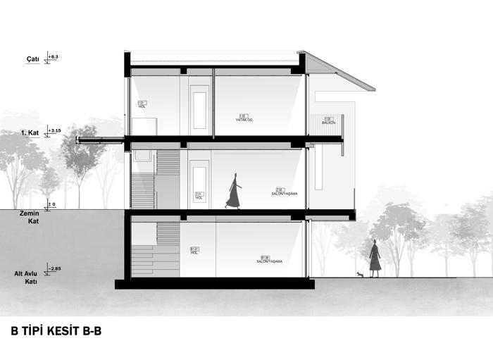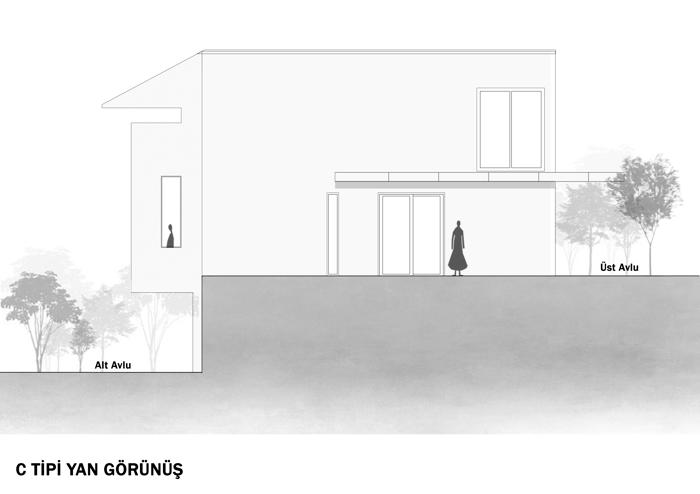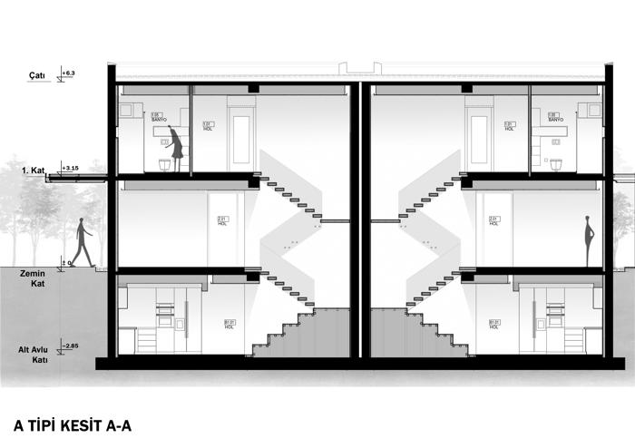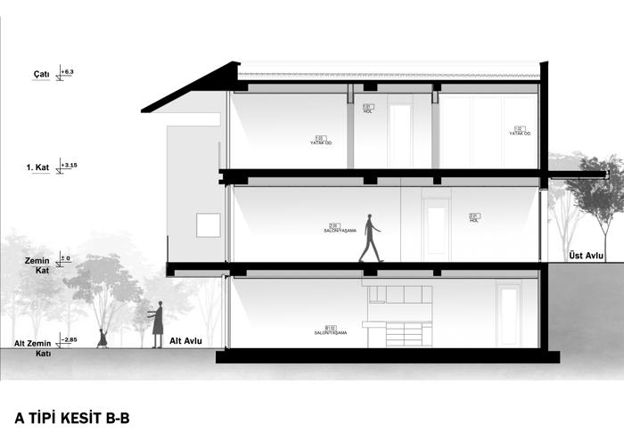 Her evin alt zemin, üst zemin katı ve bahçeleri bulunmaktadır. Kat ve bahçeler arasındaki ilişki yan bahçelerle sağlanmaktadır. Evlerin cephesini var eden mimari elemanları çatı imgesi ve bahçe kanopileri olup bunlar iç mekan ve dış mekan arasında akışkan bir arayüz yaratmaktadır.