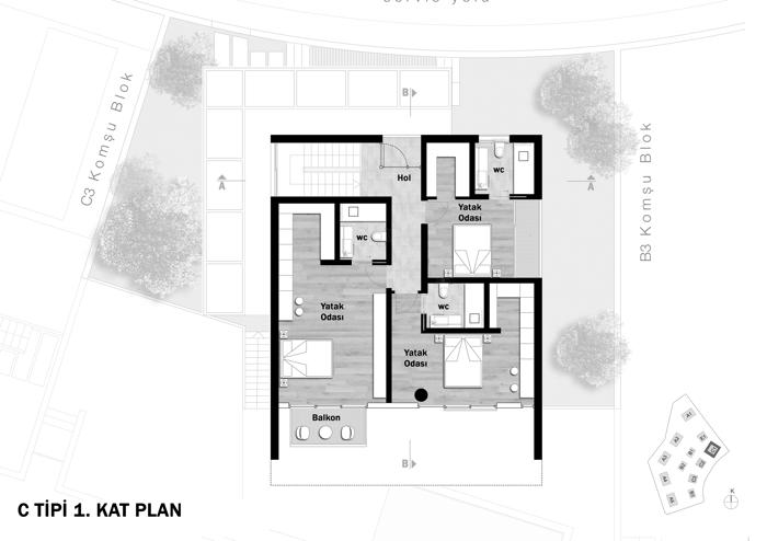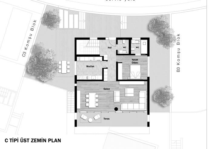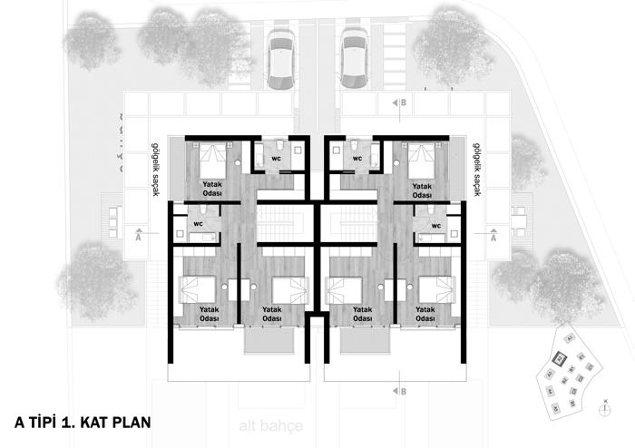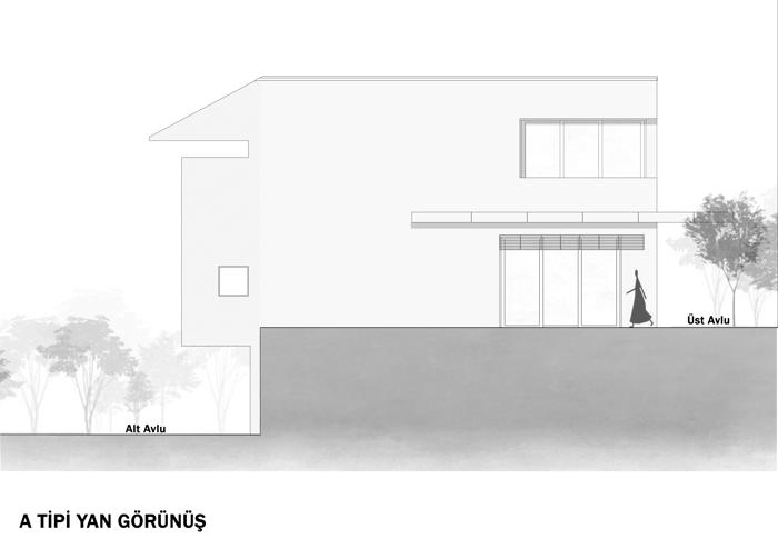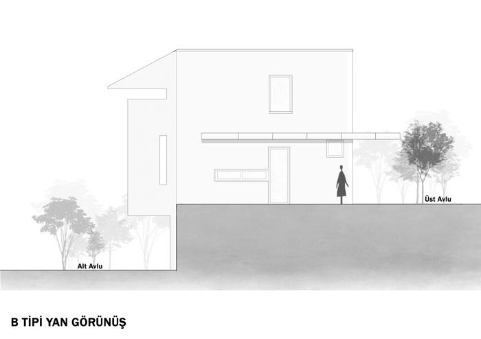 Ev’ler, bir sokak etrafında yan yana ve bağımsız birimler olarak konumlanmaktadır. Evlerin bir araya gelişinde en önemli tasarım ilkesi hem komşuluk ilişkisini güçlendirecek hem de mahremiyet eşiklerini sağlayacak bir organizasyonu gerçekleştirmektir. Bu amaçla tüm evlerin girişleri sokak cephesinden yapılmıştır. Evlerin sokak cepheleri evi yan bahçeye taşıyan bir kanopi ile çevrelenmektedir.