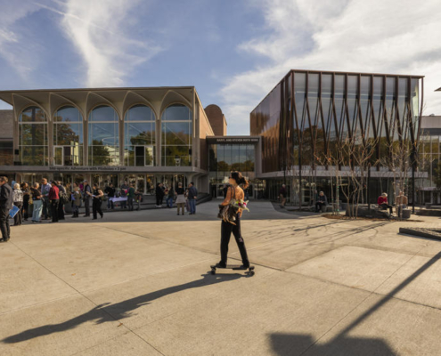 Dartmouth College’daki Hopkins Center for the Arts, Snøhetta tarafından genişletilip yeniden kurgulanarak kampüsün Sanat Bölgesi’nde yenilenmiş bir giriş kapısı işlevi kazanıyor. Tarihsel olarak Wallace K. Harrison tarafından tasarlanmış olan Edificio’nun ikonik kemerleri ve “Top of the Hop” gibi karakteristik parçaları korunurken, yapıya modern ve işlevsel eklemeler yapılmış. Yeni giriş forumu, ziyaretçileri davet eden, açık ve yönlendirici bir sosyal çekirdek olarak tasarlanmış. Bu alan, hem yerleşik yapılar ile yeni ekler arasında hem de dış mekanla iç mekan arasında güçlü bir bağ kuruyor.