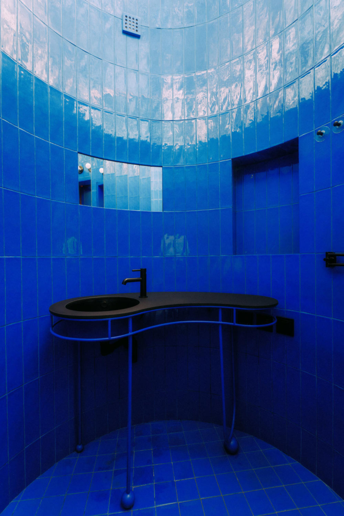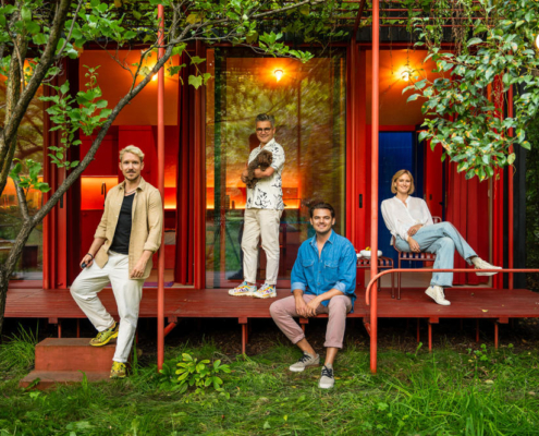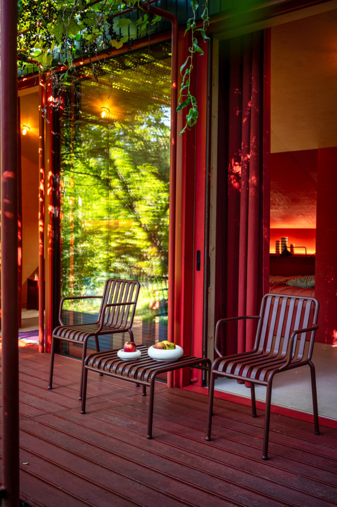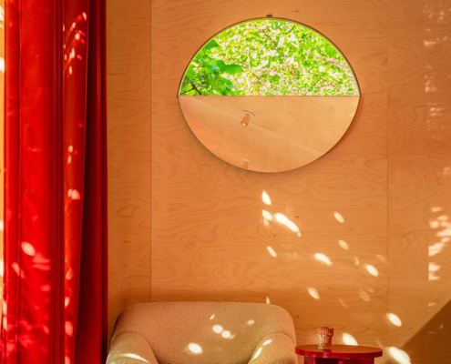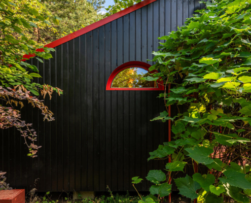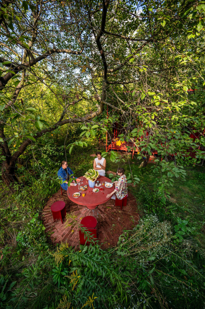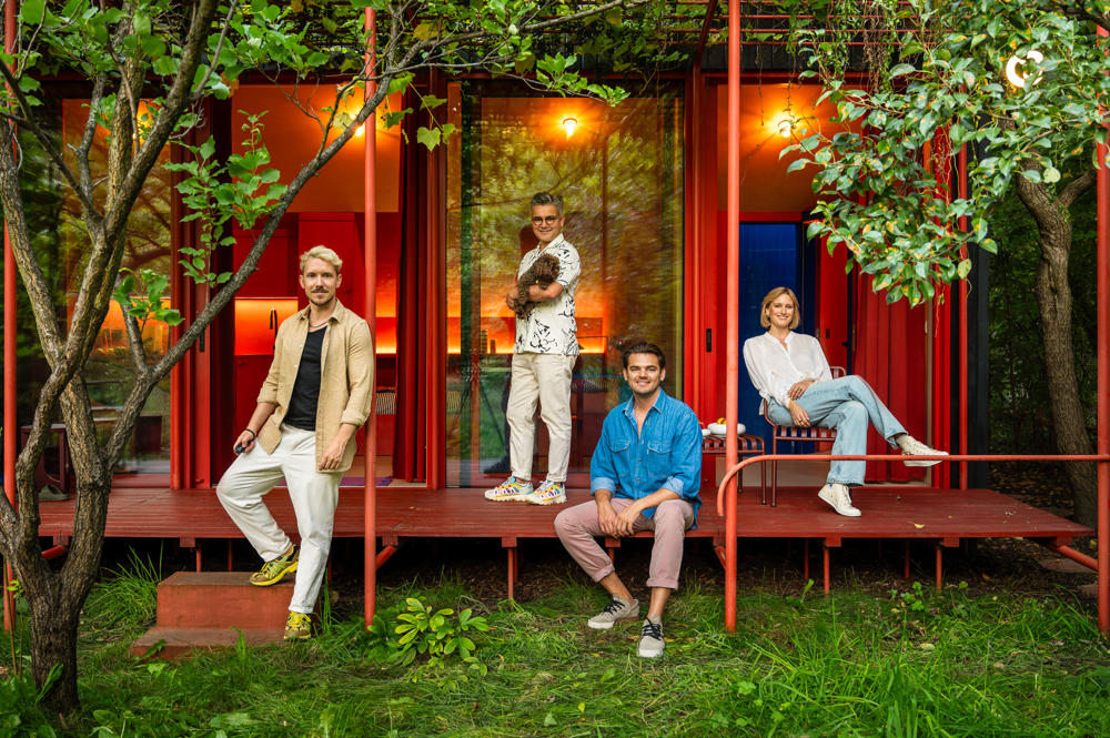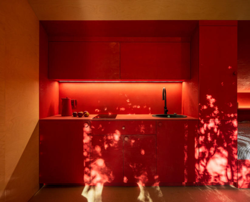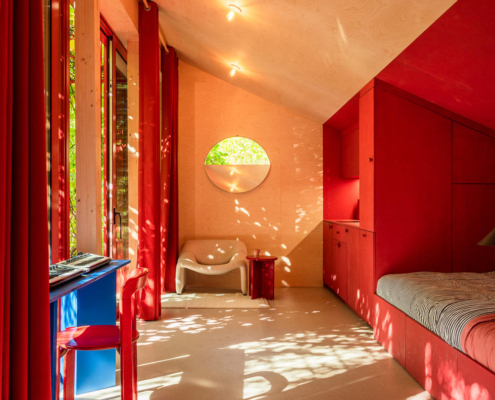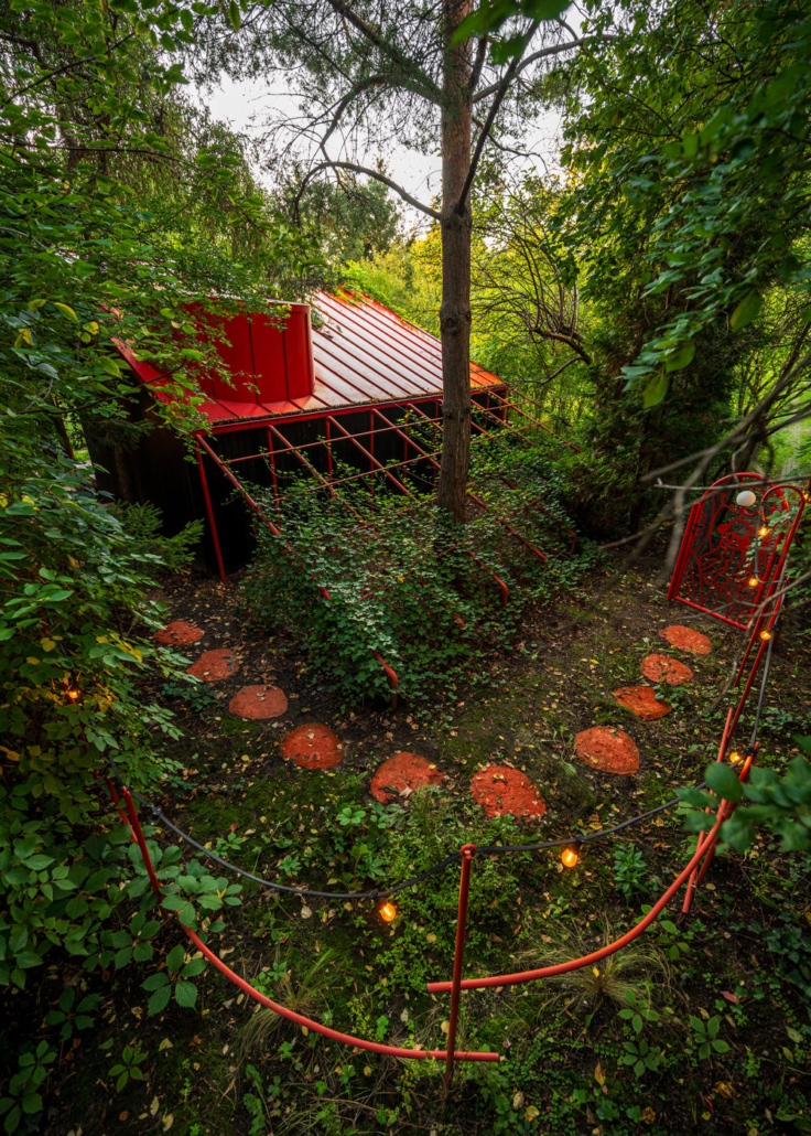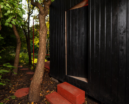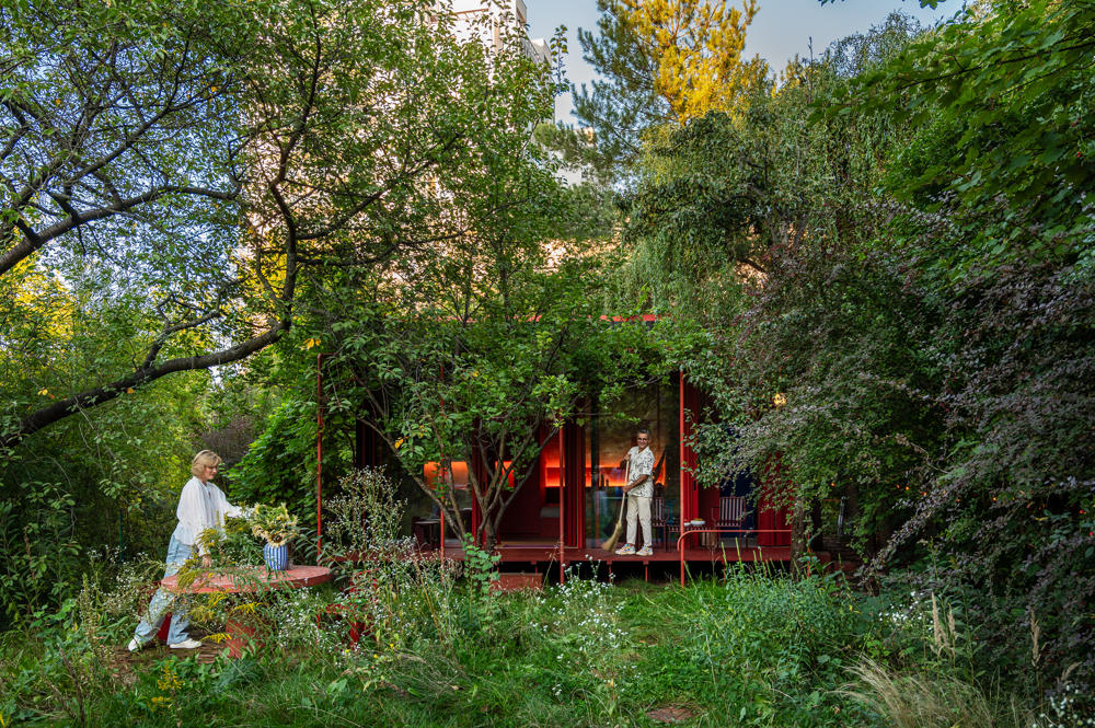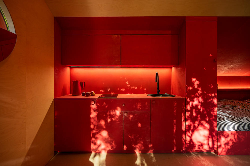 Yemyeşil, özgür açık alan; kapının, yolun, kafeslerin veya masanın kiraz-ahududu tonlarıyla ve hepsinden önemlisi iç mekanların renkleriyle kontrast oluşturuyor. Burada ev sahipleri Magda ve Grzegorz için mutfak ve çalışma alanı içeren bir yaşam alanı, bir uyku köşesi ve bir banyo bulunuyor. Kompakt alanlar, güneşli günlerde açılabilen geniş formatlı camlar sayesinde bahçeyle bütünleşiyor. Böylece hem iş hem de eğlence terasa taşınıyor.