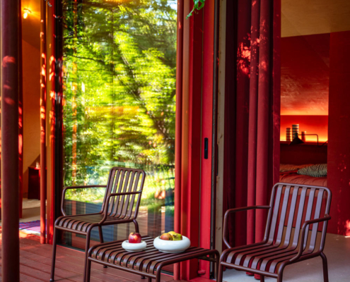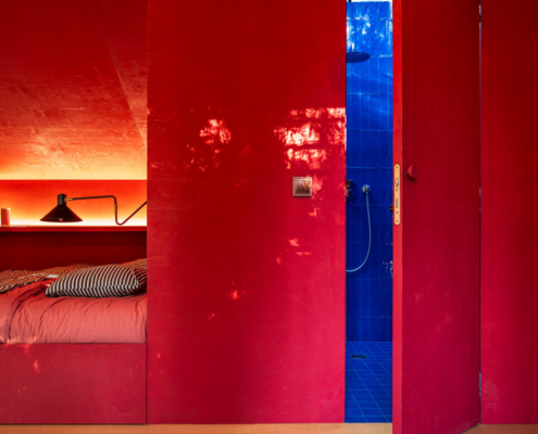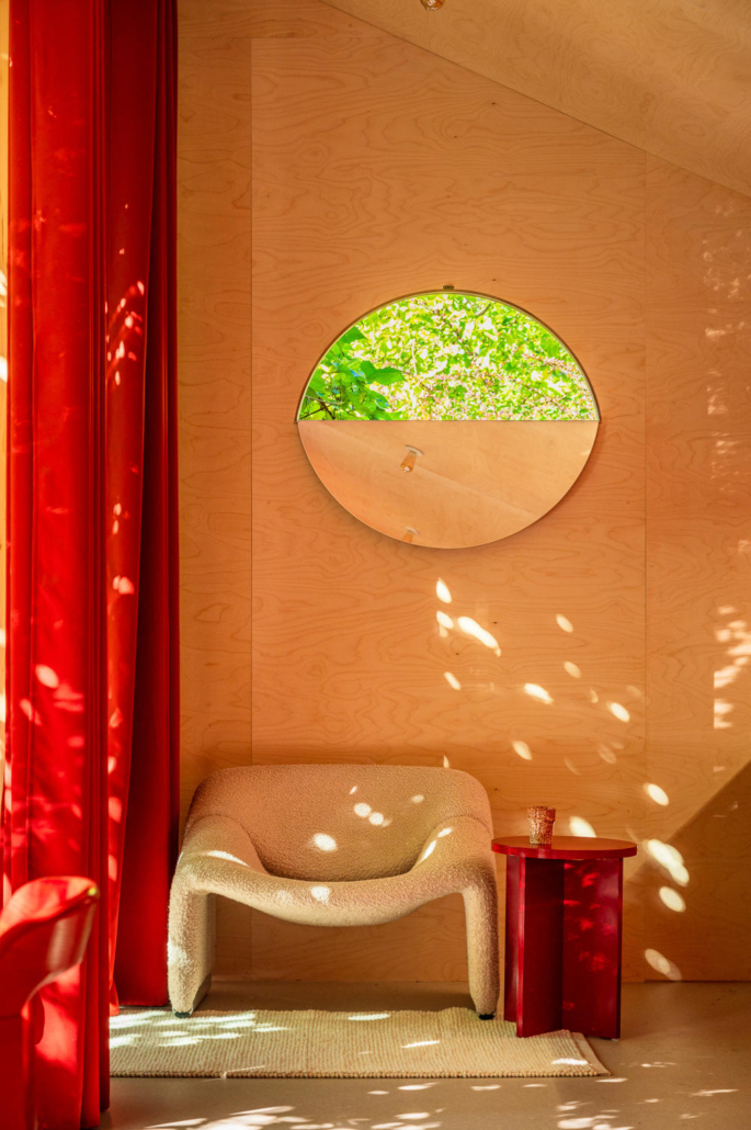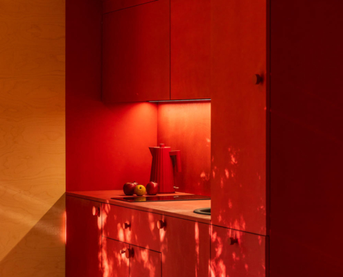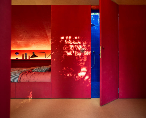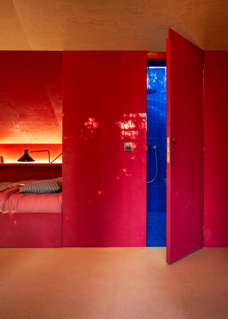 Kulübenin duvarları ve tavanları doğal, çevre dostu yağlarla boyanmış kontrplakla kaplanmış. Cama paralel duvarda ahududu rengi kullanılmış. Aynı renk birçok varyasyonda pencere çerçevelerinde, perdelerde, mutfak armatürlerinde ve birçok mobilya ve aksesuar parçasında görülüyor. Bu renkler ahşabın narin tonlarıyla dengeleniyor, yumuşak bej kumaşlara veya sessiz gri zeminlere geçiş yapıyor.