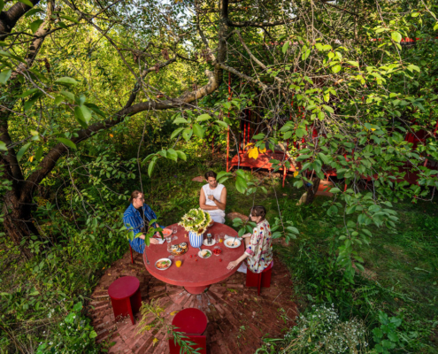 Hareketli şehir merkezinde bir kiralık evde ikamet ederken, doğayla bağlantı kurmayı özleyen müşteriler; manzara değişikliği, yaratıcı çabalar için daha iyi koşullar ve yaz aylarında sıcaktan biraz kurtulma arayışına girmişler. Bunu, Śródmieście merkez bölgesinin kentsel canlılığı ile yeşil Żoliborz’un dinginliğinin kesiştiği noktada yer alan ve hareketli metropolün ortasında gerçek bir sığınak sunan tahsis bahçesinde buluyorlar. Bu sığınağın içinden, yemyeşil doğayla yan yana yükselen gökdelenlerin oluşturduğu şehir silüetine bakılabiliyor. Yine de şehir manzarasının ortasında doğanın hüküm sürdüğü bir alan tanımlıyor.