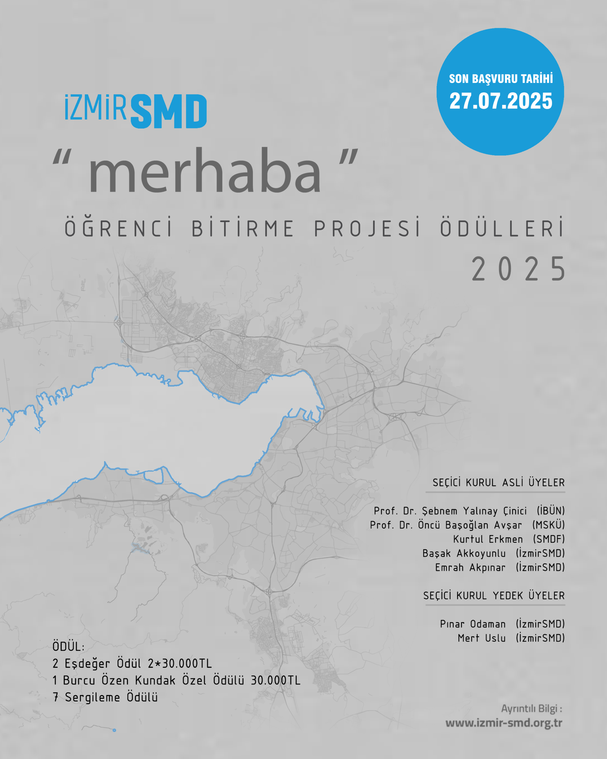 İzmir Serbest Mimarlar Derneği tarafından 2017 yılından bu yana İzmir’deki mimarlık okulları arasından en nitelikli bitirme projelerini seçmek adına açılan “Merhaba – İzmirSMD Öğrenci Bitirme Projesi Ödülleri” için son başvuru tarihi 27 Temmuz olarak belirlendi.