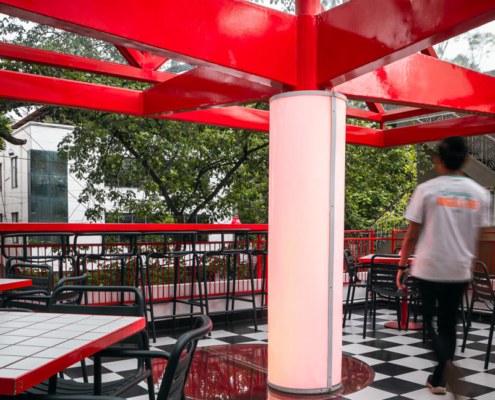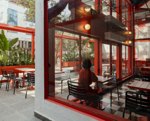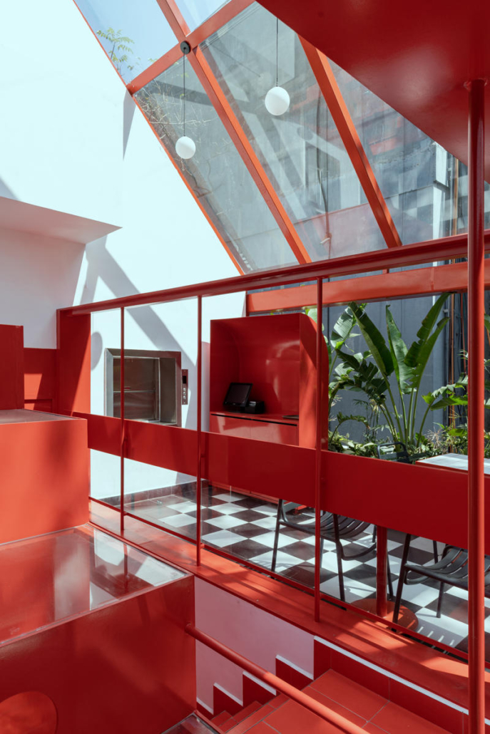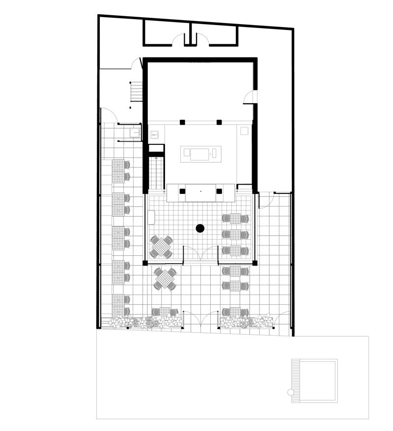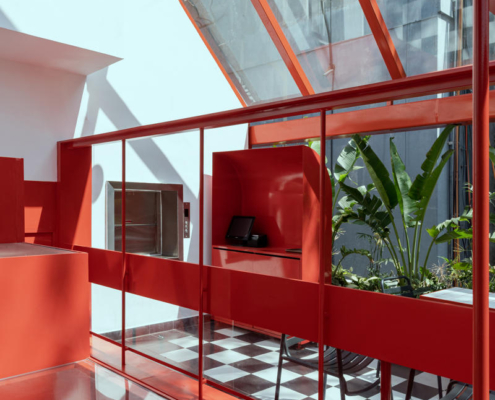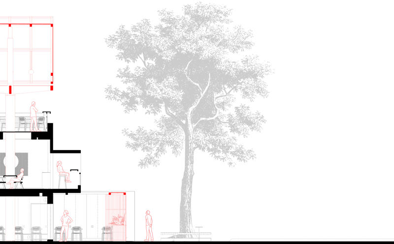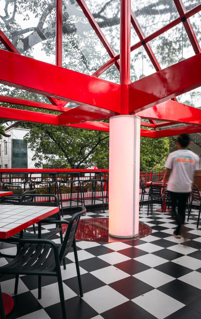 Binanın üzerine monte edilen çarpıcı bir cam çatı bu dikeyliği ifade etmek için ortaya çıkmış. Bu çatı, dışarıdaki yağmur ağacına bir övgü niteliğinde, genellikle ağaçların yaprakları arasından süzülen yumuşak, benekli ışığı temsil ediyor. Ayrıca, çatıyı kutsallaştırma işlemi, yemek yeme amaçlı ve fazla ihtiyaç duyulan zemin alanını artırarak binayı ticari olarak uygulanabilir ve de arsanın yüksek gayrimenkul değerine layık hale getirmiş. Çatı, dikey bir kolonla yapısal olarak zemine sabitlenmiş ve her katta bulunan ortak masaları birbirine bağlarken aynı zamanda estetik bir unsur haline gelmiş. Bina, stratejik eklemelerle gökyüzüne ve önündeki caddeye doğru uzanmış böylece alan ve arazi kullanımı en üst düzeye çıkarılmış.