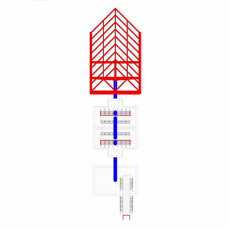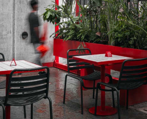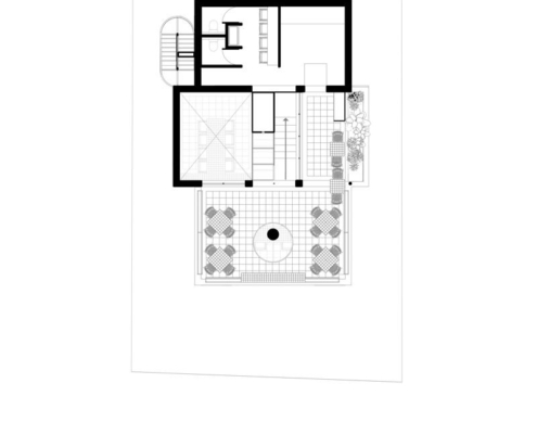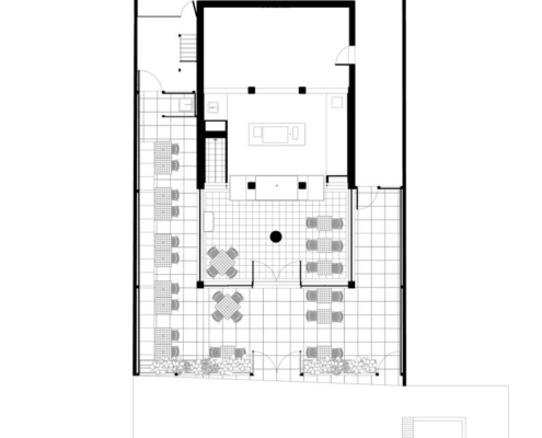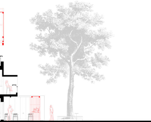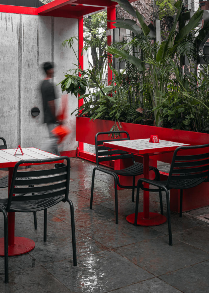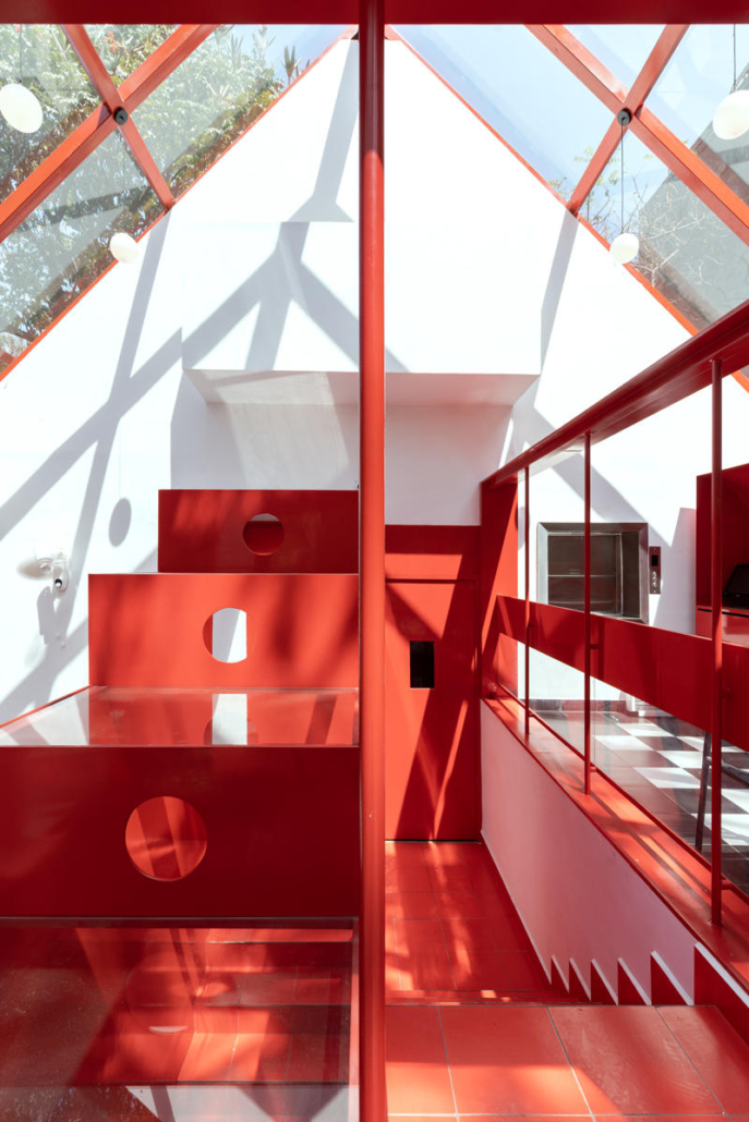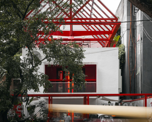 Binanın üzerine monte edilen çarpıcı bir cam çatı bu dikeyliği ifade etmek için ortaya çıkmış. Bu çatı, dışarıdaki yağmur ağacına bir övgü niteliğinde, genellikle ağaçların yaprakları arasından süzülen yumuşak, benekli ışığı temsil ediyor. Ayrıca, çatıyı kutsallaştırma işlemi, yemek yeme amaçlı ve fazla ihtiyaç duyulan zemin alanını artırarak binayı ticari olarak uygulanabilir ve de arsanın yüksek gayrimenkul değerine layık hale getirmiş. Çatı, dikey bir kolonla yapısal olarak zemine sabitlenmiş ve her katta bulunan ortak masaları birbirine bağlarken aynı zamanda estetik bir unsur haline gelmiş. Bina, stratejik eklemelerle gökyüzüne ve önündeki caddeye doğru uzanmış böylece alan ve arazi kullanımı en üst düzeye çıkarılmış.