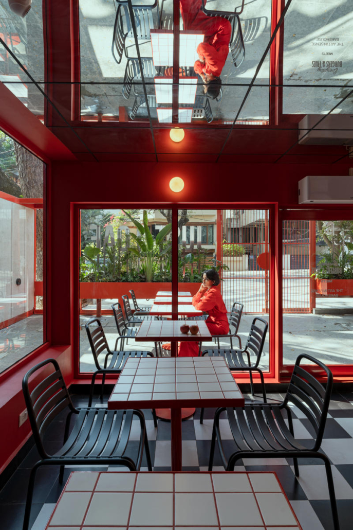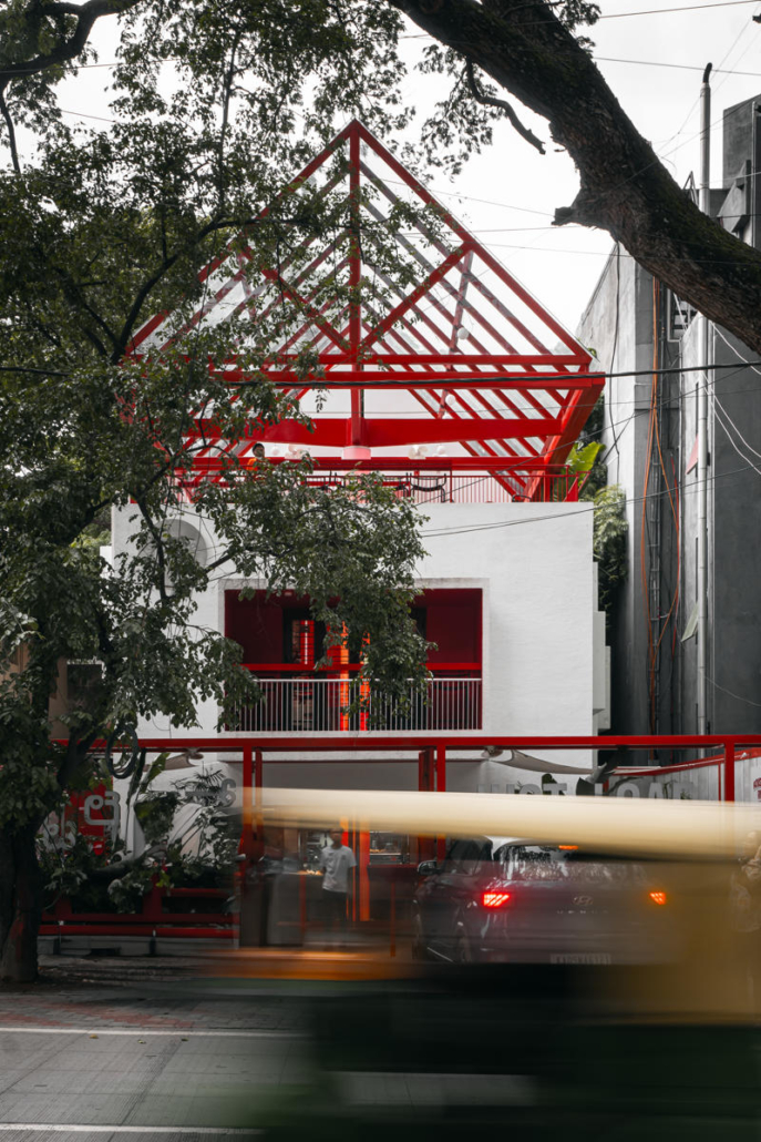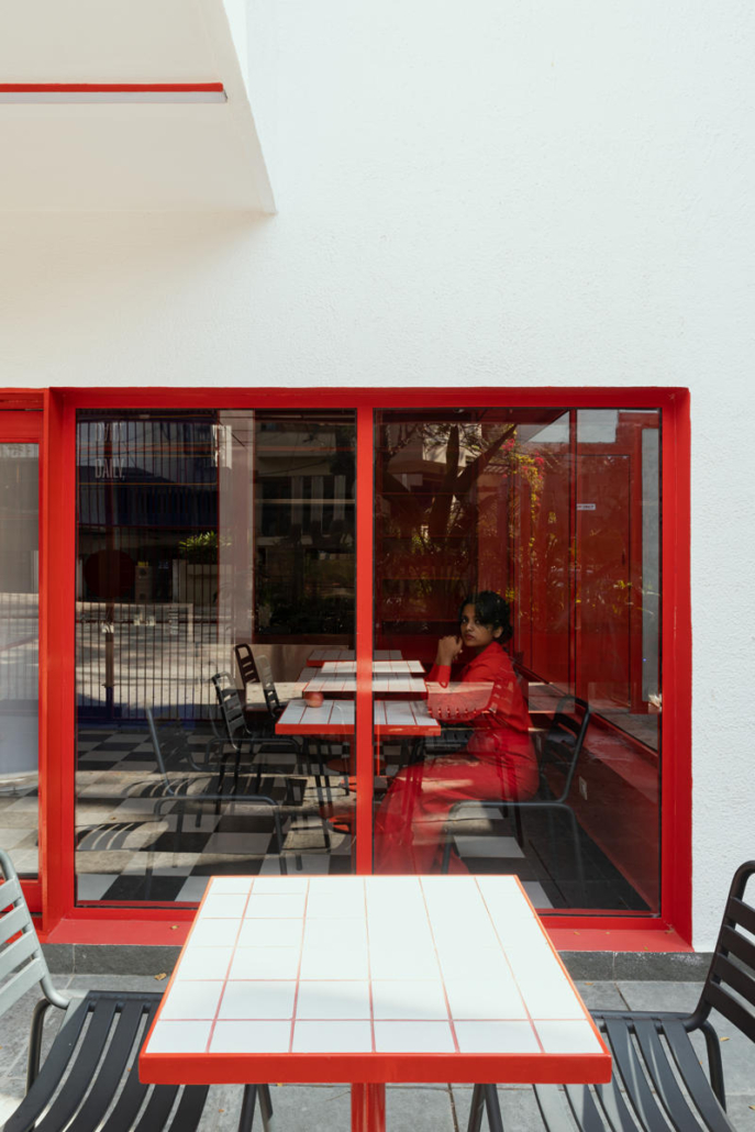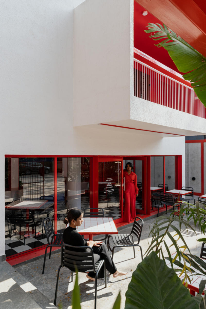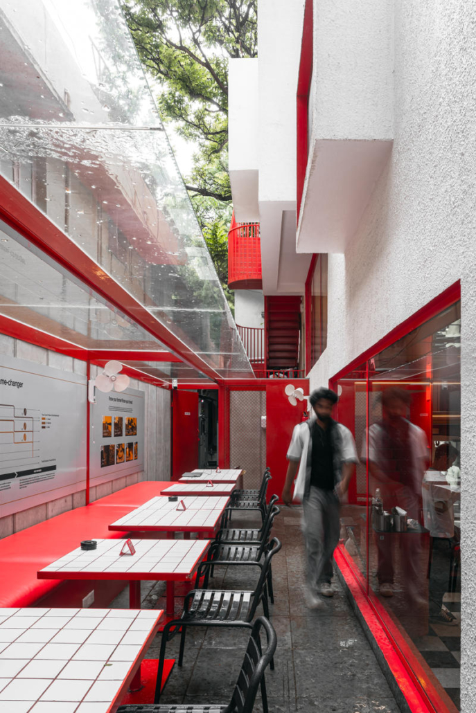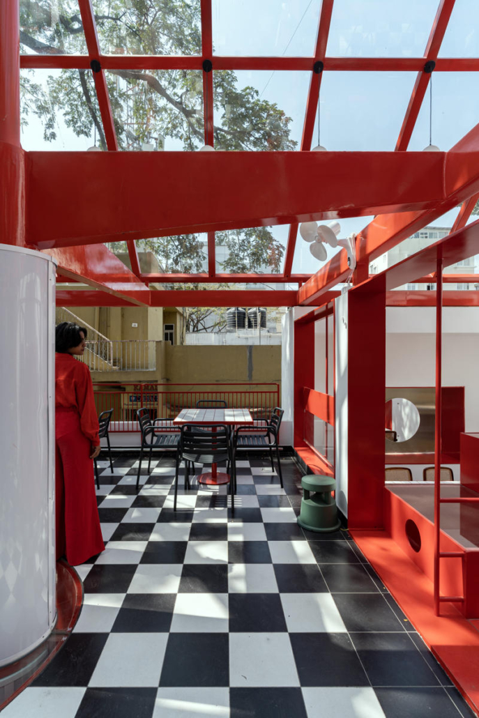 Renk seçimi, Bangalore’un canlı ve özgün pub kültürünü anımsatırken, siyah beyaz kareli zemin ise Amerikan “diner”larını akla getiriyor. Sınırlı bir alanın kısıtlamaları içinde, malzeme paleti iç hacmi genişletip zenginleştirmeyi başararak müşterilere geniş bir oda illüzyonu yaşatıyor. Dış cephede aynı malzemelerin sürekliliği ve camın akıllı kullanımı, iç ve dış mekanlar arasında kesintisiz bir bağlantı yaratıyor. Sürekli genişleyen bir topluluk masası fikri, dikey hacimleri dramatik bir şekilde birbirine bağlayan zemin döşemesindeki deliklerle ifade edilmiş.