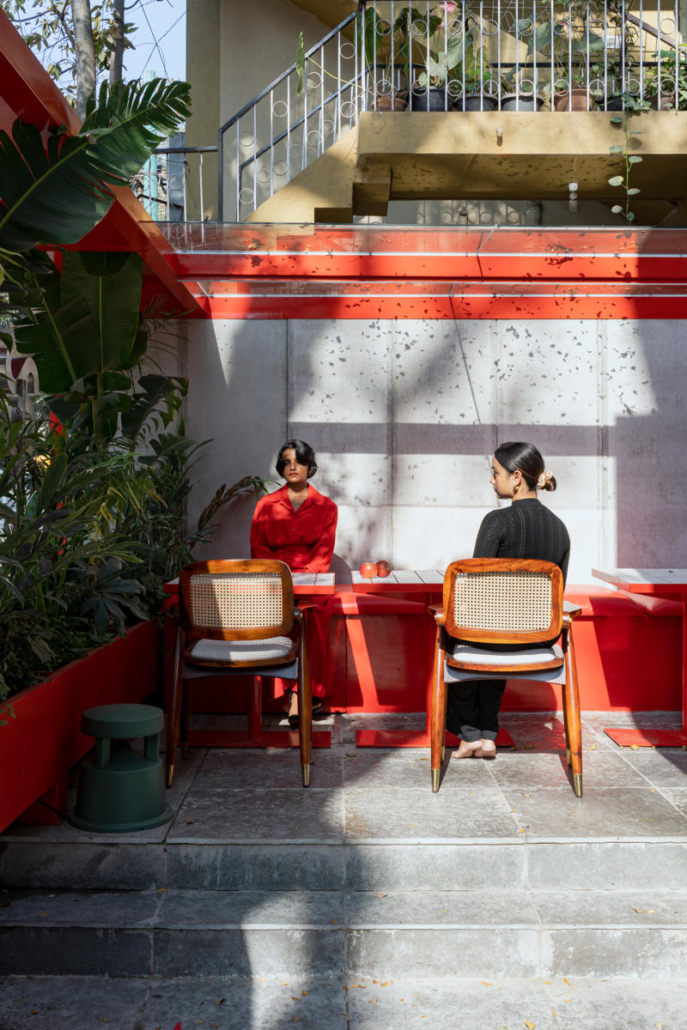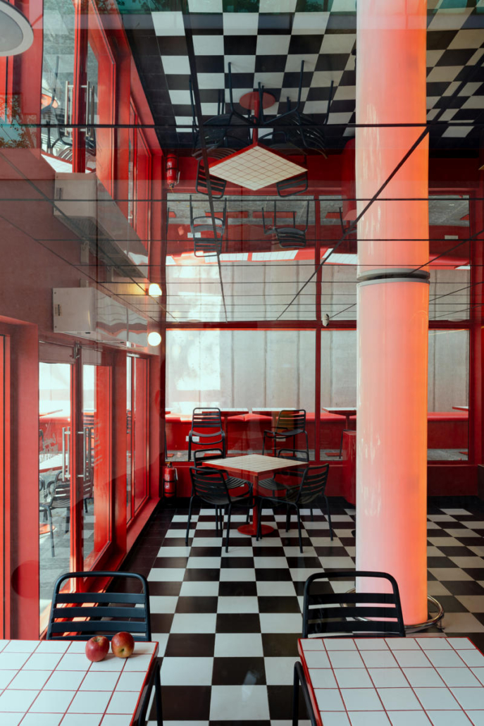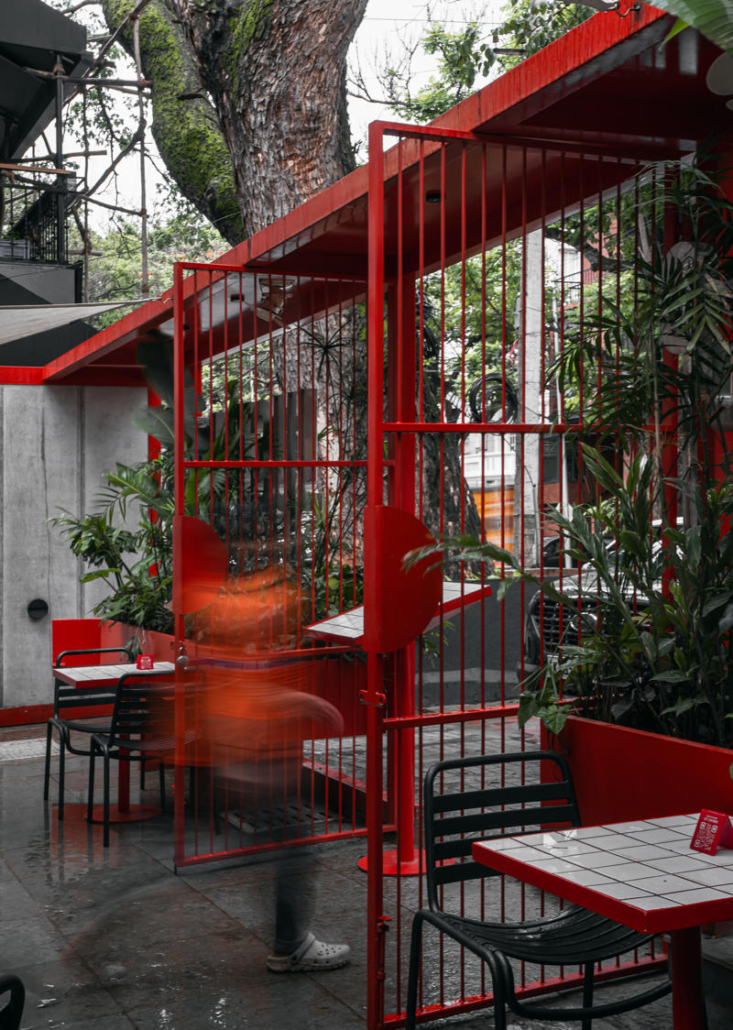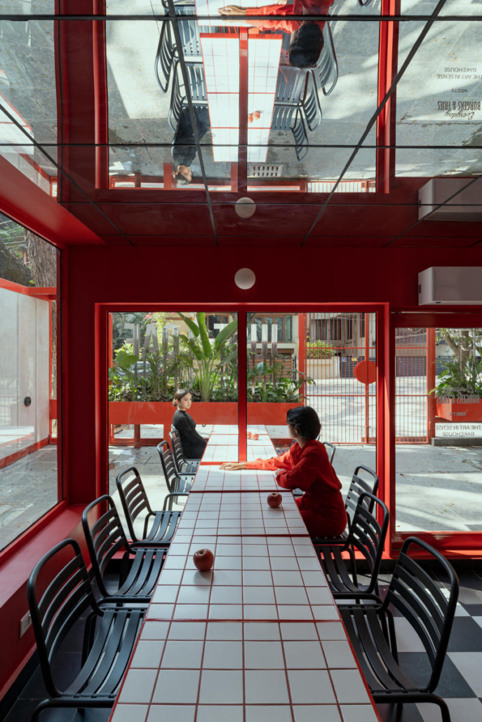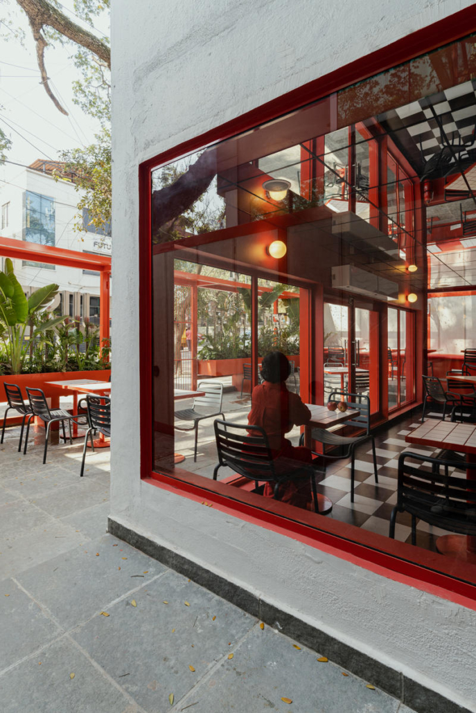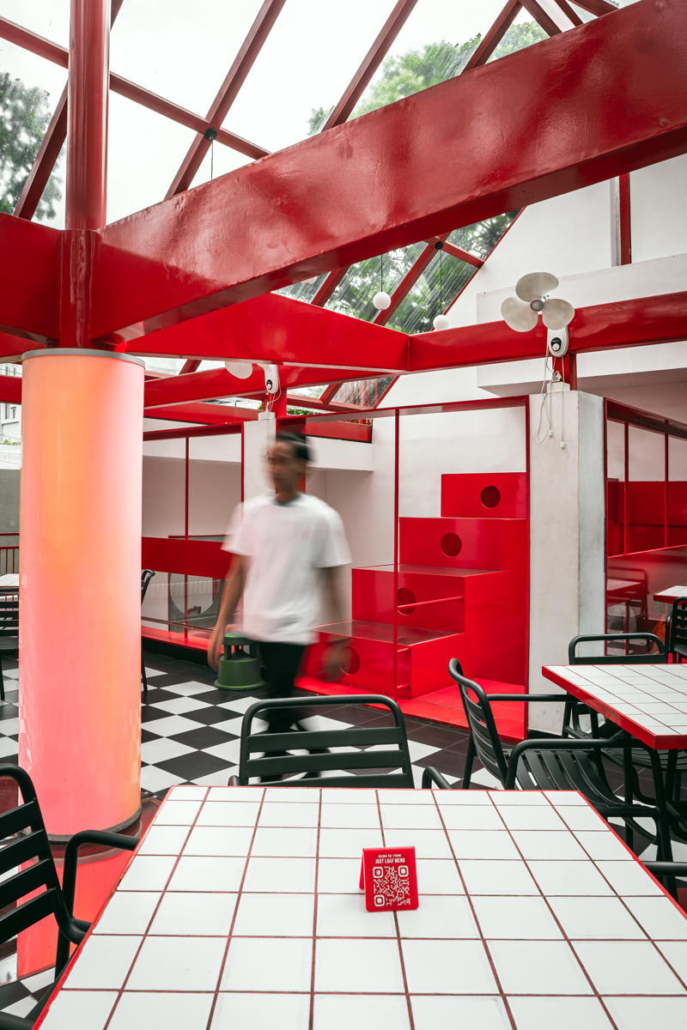 Renk seçimi, Bangalore’un canlı ve özgün pub kültürünü anımsatırken, siyah beyaz kareli zemin ise Amerikan “diner”larını akla getiriyor. Sınırlı bir alanın kısıtlamaları içinde, malzeme paleti iç hacmi genişletip zenginleştirmeyi başararak müşterilere geniş bir oda illüzyonu yaşatıyor. Dış cephede aynı malzemelerin sürekliliği ve camın akıllı kullanımı, iç ve dış mekanlar arasında kesintisiz bir bağlantı yaratıyor. Sürekli genişleyen bir topluluk masası fikri, dikey hacimleri dramatik bir şekilde birbirine bağlayan zemin döşemesindeki deliklerle ifade edilmiş.
