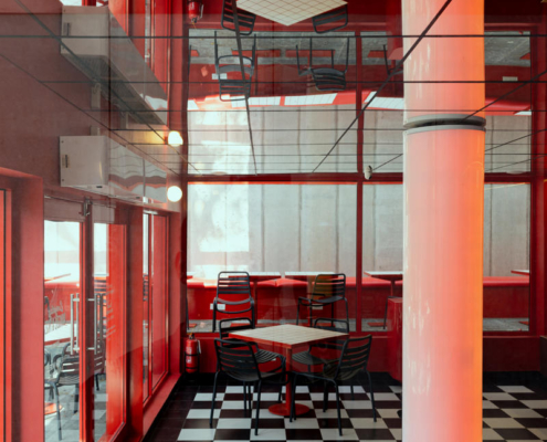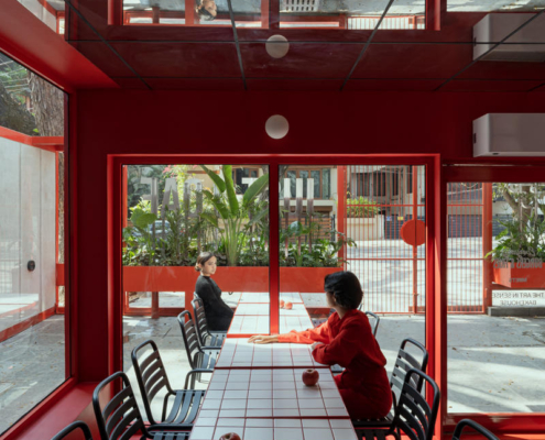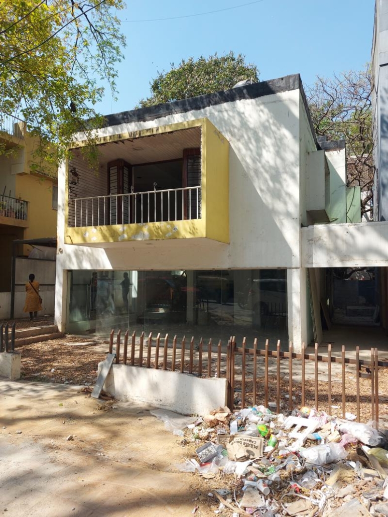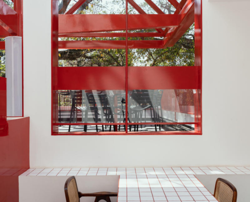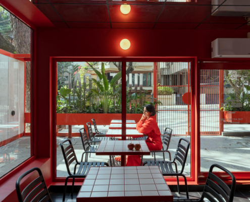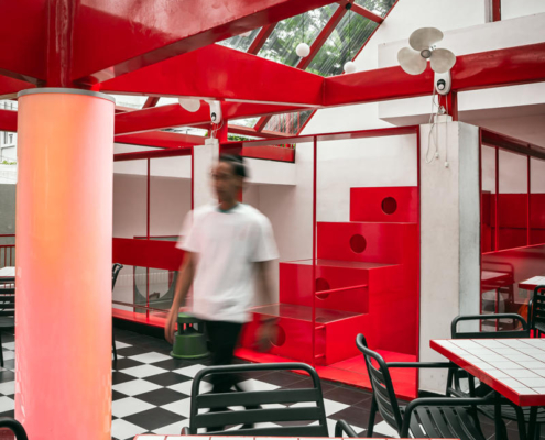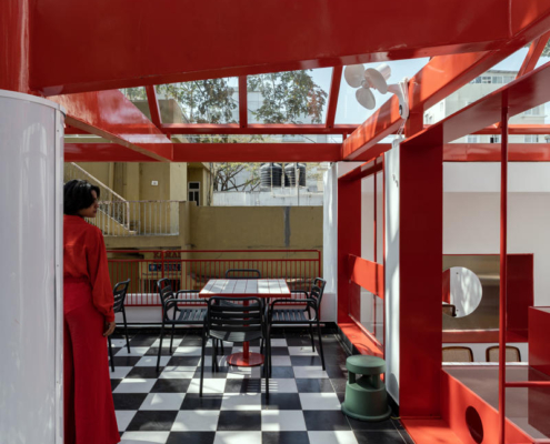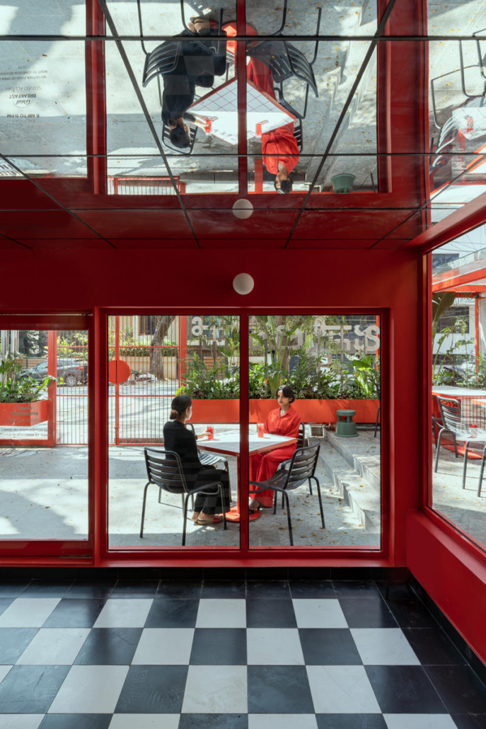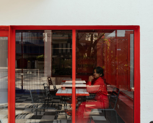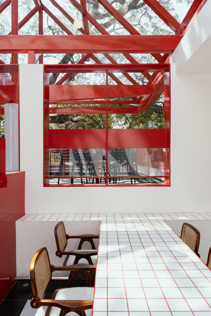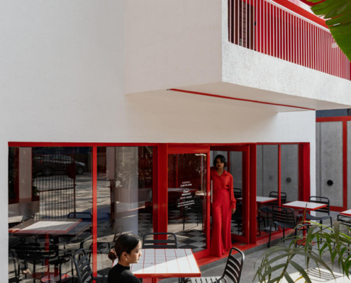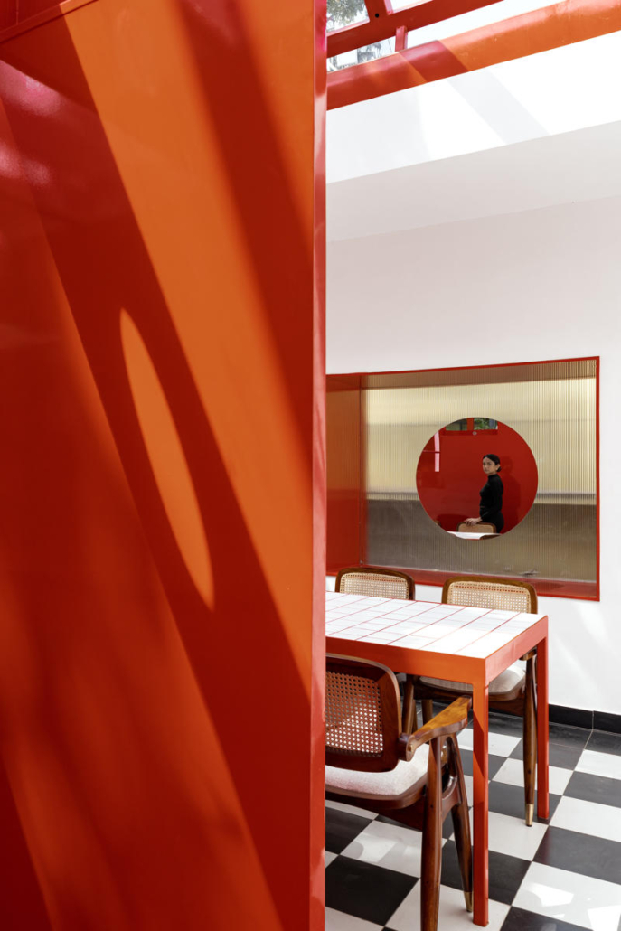 Renk seçimi, Bangalore’un canlı ve özgün pub kültürünü anımsatırken, siyah beyaz kareli zemin ise Amerikan “diner”larını akla getiriyor. Sınırlı bir alanın kısıtlamaları içinde, malzeme paleti iç hacmi genişletip zenginleştirmeyi başararak müşterilere geniş bir oda illüzyonu yaşatıyor. Dış cephede aynı malzemelerin sürekliliği ve camın akıllı kullanımı, iç ve dış mekanlar arasında kesintisiz bir bağlantı yaratıyor. Sürekli genişleyen bir topluluk masası fikri, dikey hacimleri dramatik bir şekilde birbirine bağlayan zemin döşemesindeki deliklerle ifade edilmiş.