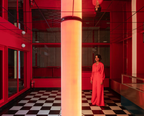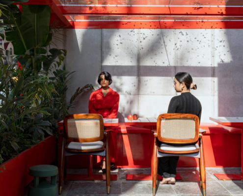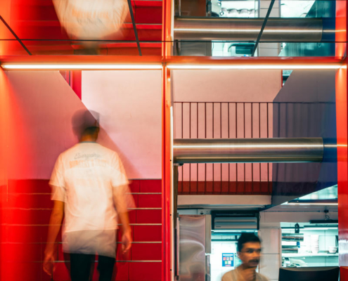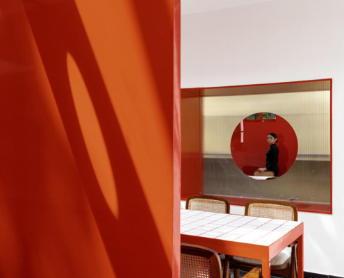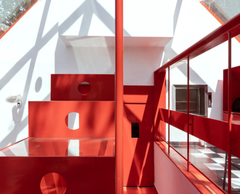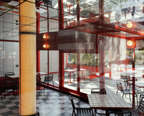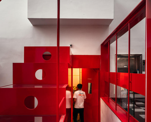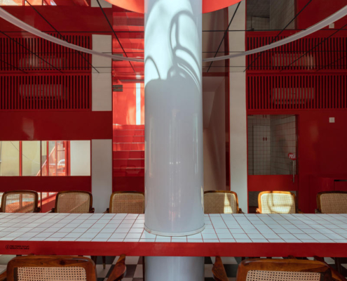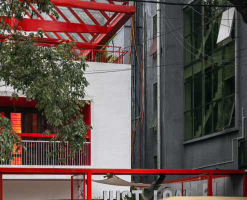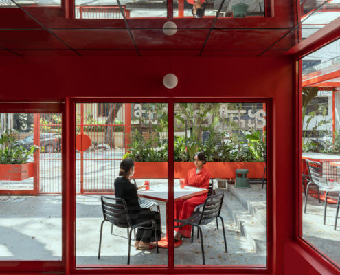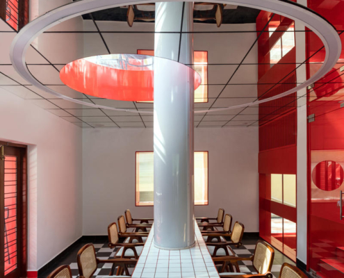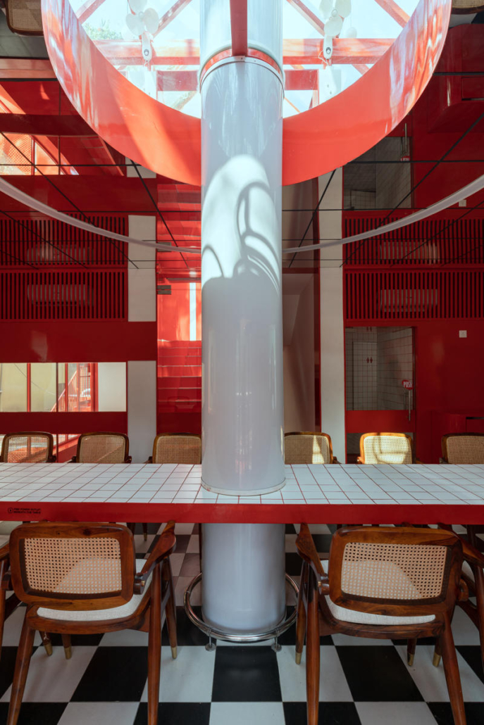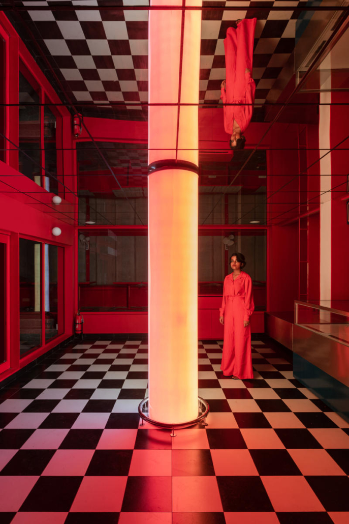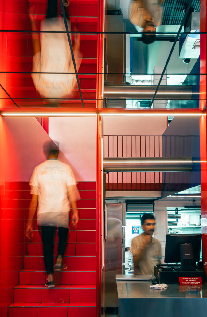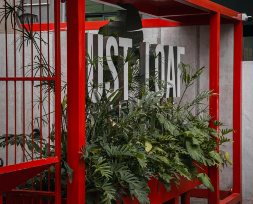 Sokak, bitki örtüsüyle kaplı tampon bölge ve kahve tezgahı olarak işlev gören dönüştürülmüş bir eşik aracılığıyla binaya taşınarak, aktif bir ön bahçe oluşturmuş. Birinci kattaki balkon korkulukları, sokağa başka bir bakış açısı sunan yüksek bir masaya dönüşmüş. Just Loaf’un ilk versiyonuna tematik olarak benzer şekilde, hizmet edilen ve hizmet eden alanların basit netliğinin altı çizilmiş; her katta ikisini de aynı şekilde ayırmışlar. Topluluk masalarının birbirine bağlanması, alanı ikiye katlayarak devam eden bir hacim illüzyonu yaratan aynalı yüzeylerin tuhaf kullanımıyla daha da vurgulanmış. Sütun da bu tasarımın eğlenceli ve kitsch doğasını yansıtmış ve iç mekanları pop renklerle dolduran, sürekli değişen bir ortam aydınlatma öğesi haline gelmiş. Müşterilere birçok tasarım özgürlüğü sağlayan sütun, standart günlük aydınlatmadan Cadılar Bayramı veya Holi gibi bayramlarda şenlikli, tuhaf versiyonlara dönüşebiliyor.
