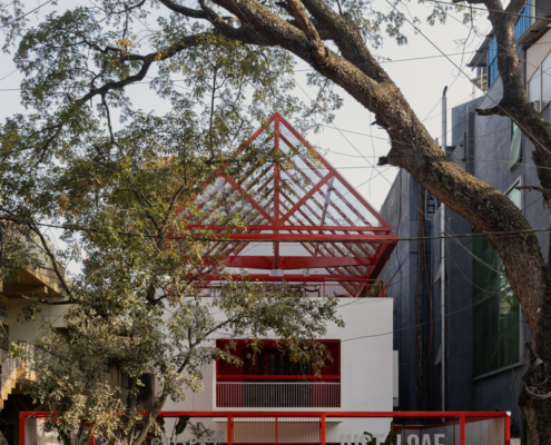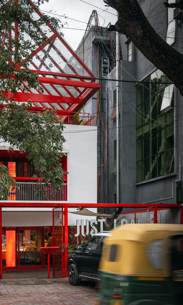 Just Loaf’un tasarım ekibi, Bangalore’un merkezinde yer alan, ön cephesinde bir yağmur ağacı bulunan kırk yıllık beton yapıdan yola çıkarak tasarlanmış. Tipik kentsel arsa tipolojisinde uygun olarak inşa edilen bina bitişik nizamda yer aldığı için sadece önündeki caddeye ve gökyüzüne büyümeye imkan kalmış. Bu dikeylikten, bölünmüş katlar etrafında planlanmış bir bina tasarımı ortaya çıkmış.