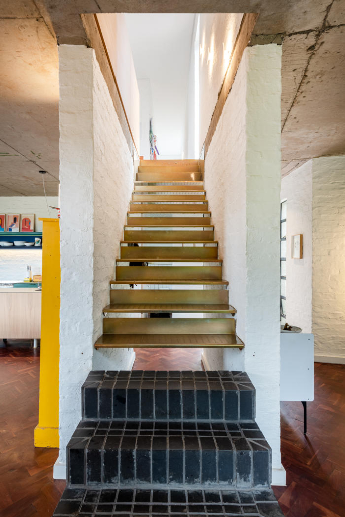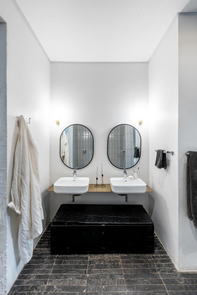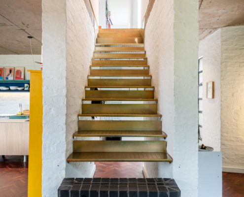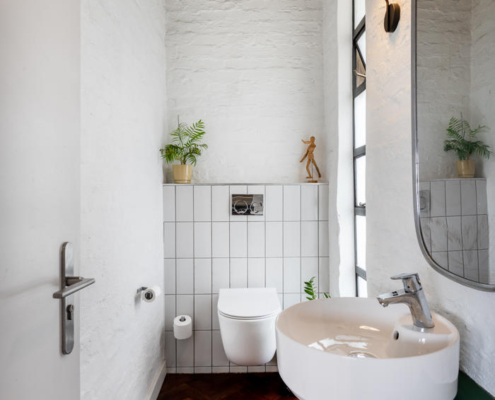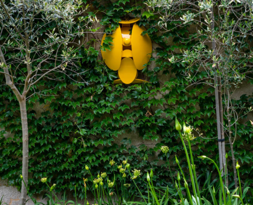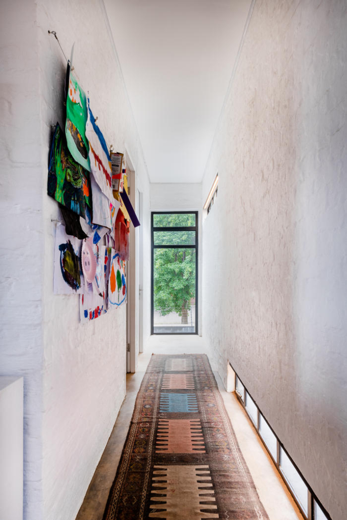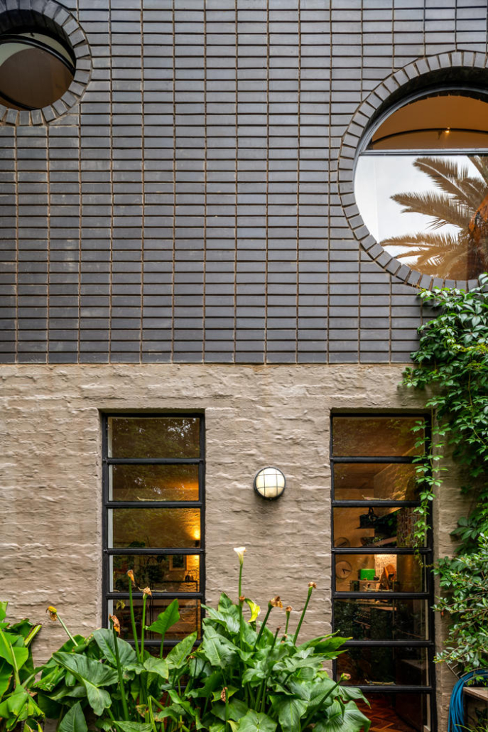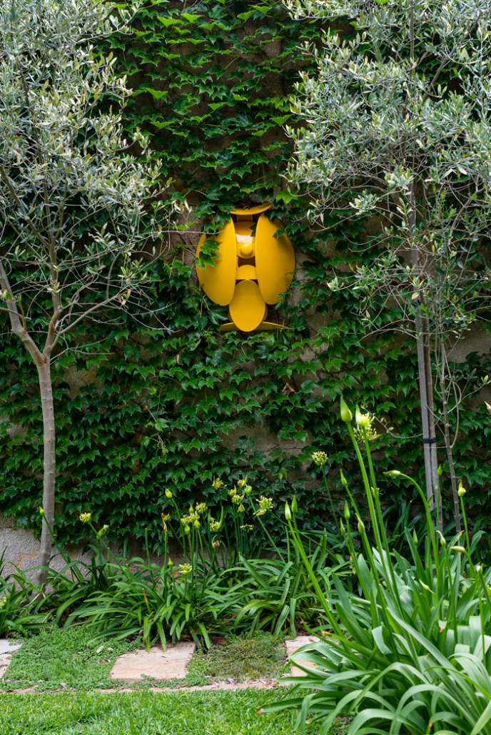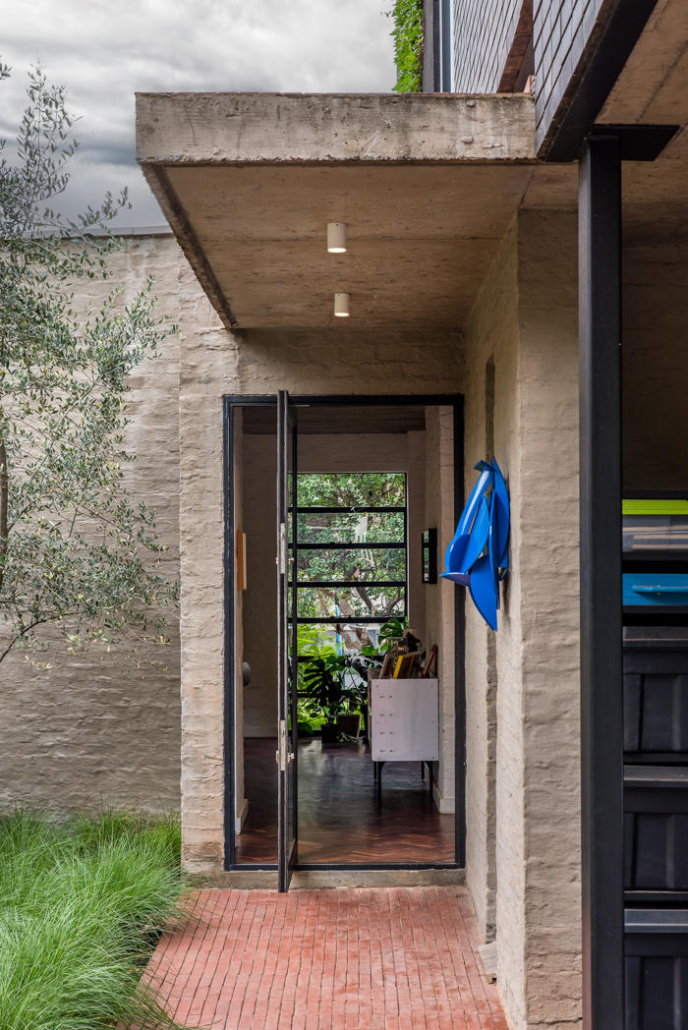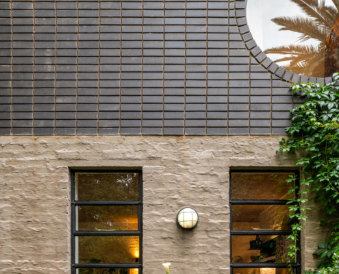 Evin dış mekanı, malzemeler arasındaki karşıtlığı dikkat çekici bir şekilde sergiliyor. Burada koyu renk tuğlalar ve sıvalı duvarlar güçlü ama incelikli bir cephe oluşturuyor. Büyük ve stratejik olarak konumlandırılmış pencereler, etraftaki yeşil alanla güçlü bir ilişki kurarken aynı zamanda davetkar iç mekanlara bakışlar sunuyor. Hem bir sınır hem de birleştirici bir unsur olarak işlev gören ön avlu, iki evi birbirine pürüzsüzce bağlarken ortak yaşam alanları arasındaki kohezyon hissini de pekiştiriyor. Kalm West yeşil kiremitleri ile dikkat çekiyor, aralara dikkatlice yerleştirilmiş olan sarı kiremitler ile Kalm East’i tasarlanmış yankılar ile yansıtırken iki evi görsel olarak birbirine bağlıyor.
