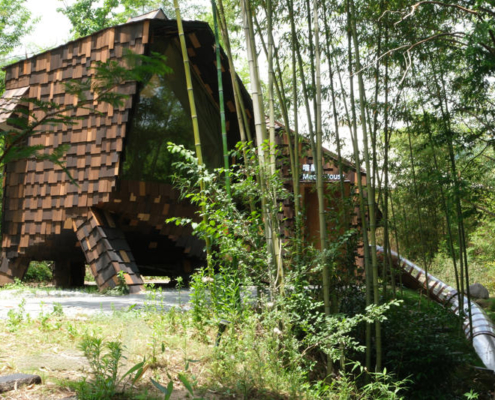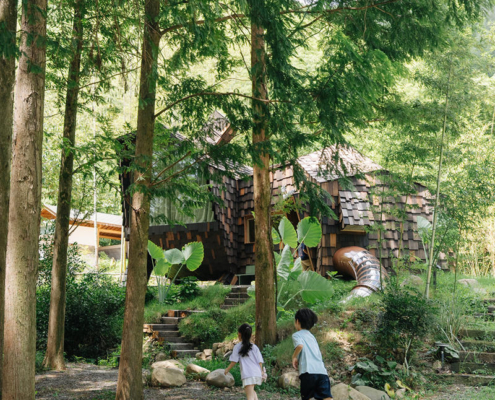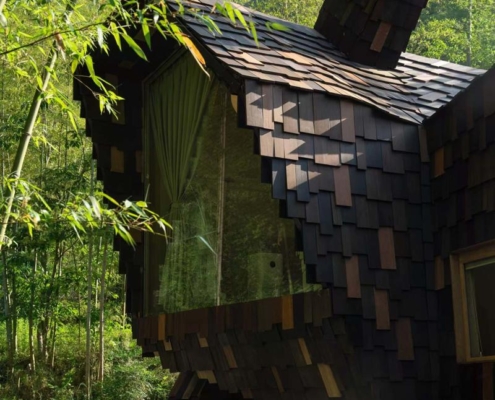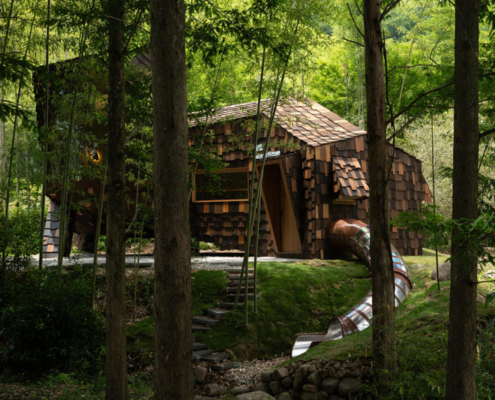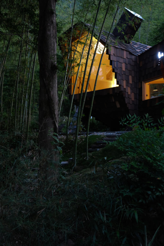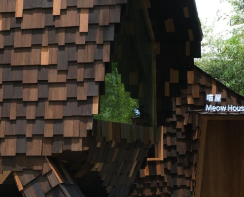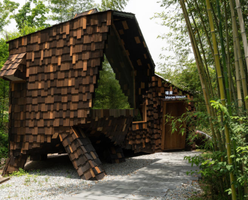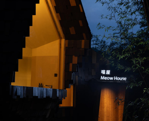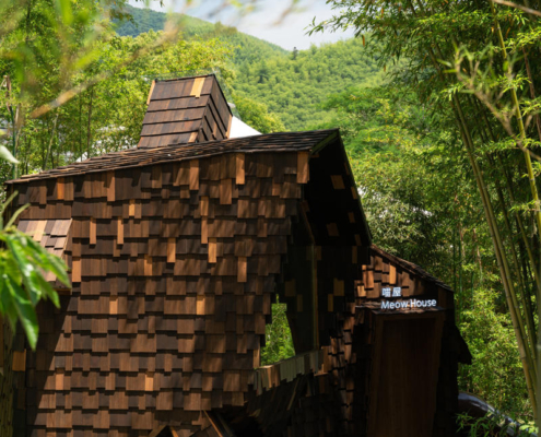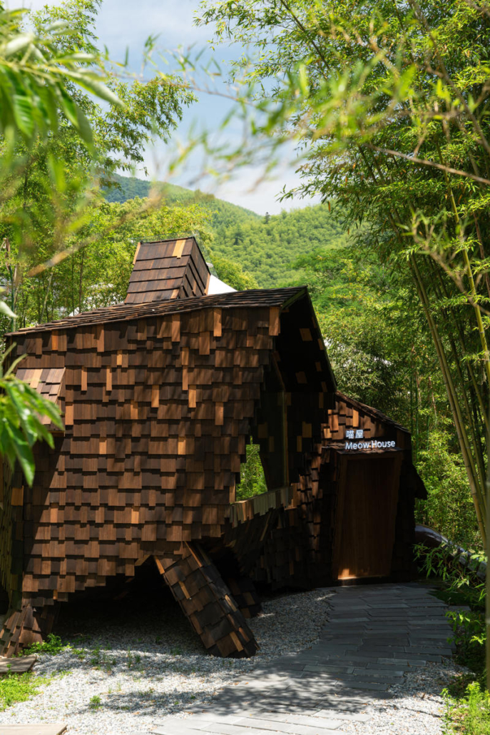 Tasarım sürecinden önce defalarca ziyaret edilen proje alanı, uygulama aşamasında da belirleyici olmuş. Sınırlı bütçe koşulları, prefabrikasyon temelli bir çözümü beraberinde getirmiş; yapı üç parçaya bölünerek yaklaşık yüzde sekseni şantiye dışında üretilmiş, ardından Hangzhou’dan Anji’ye taşınarak yerinde monte edilmiş. Böylece Kedi Ev, orman içindeki yuvasına yerleşmeden önce kendi yolculuğunu tamamlamış. Küçük ölçeğine rağmen güçlü bir mekansal deneyim sunan Kedi Ev, doğayla uyumlu yaşam fikrini oyun, konaklama ve manzara üzerinden yeniden yorumluyor. Yapının tamamlanmasının ardından işveren tarafından “Meow House” olarak adlandırılması, bu canlı ve neşeli karakterin doğal bir uzantısı olarak öne çıkıyor.