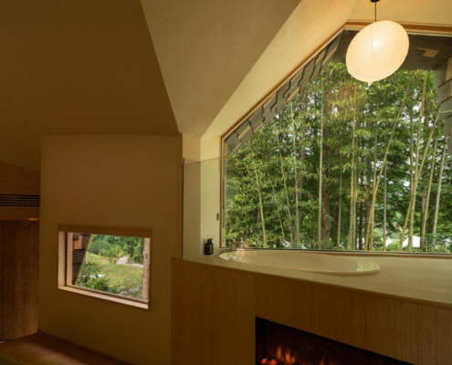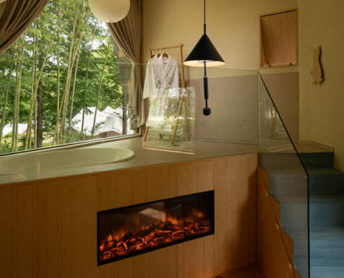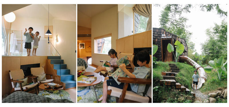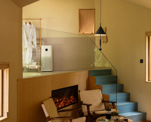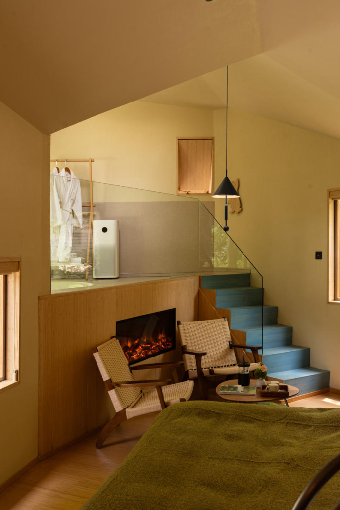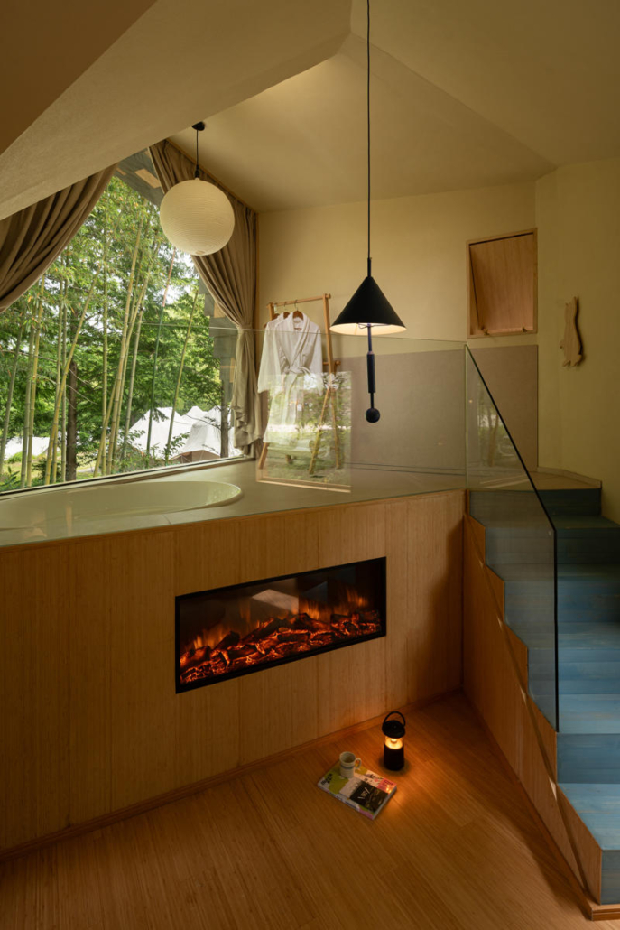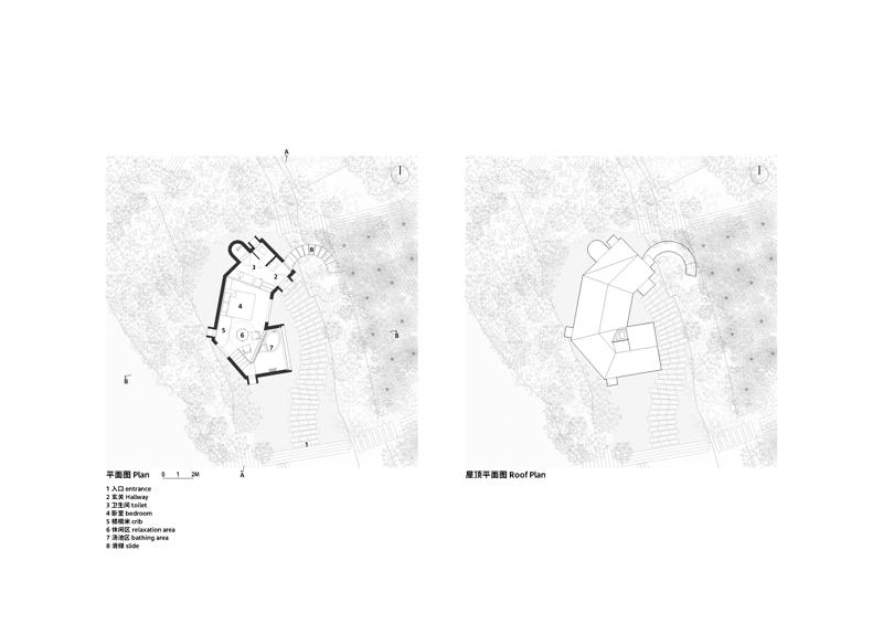 Dış formun şekillenmesi, iç mekanda üç farklı kotun oluşmasını sağlamış ve alan doğal biçimde bölümlere ayrılmış. Giriş kotu kaydırağa bağlanırken lavabo ve tuvalet gibi işlevleri barındırıyor; orta kotta yatak ve yaşam alanı yer alıyor ve bu bölüm yapının en mahrem, koza benzeri mekansal deneyimini sunuyor. En üst kotta konumlanan manzaralı banyo ise çocukların suyla ve çevreyle ilişki kurabileceği, oyun duygusu güçlü bir ıslak hacim olarak kurgulanmış.