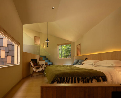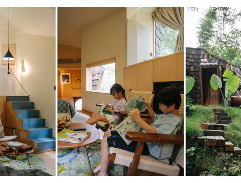 Kedi Ev, bir koruluk içinde konumlanan, suya ve uzak dağ manzarasına yönelen bağımsız bir misafir odası olarak tasarlanmış; formu, bir kedinin çevresine uyum sağlayan bedenini çağrıştıran sezgisel bir kurguya dayanıyor. Yapı, “başını” manzaraya doğru uzatırken, “kuyruğunu” bir kaydırakla tamamlıyor; çocuklar iç mekandaki bir dolap kapısından girerek bu kaydırağın başlangıç noktasına ulaşıyor.