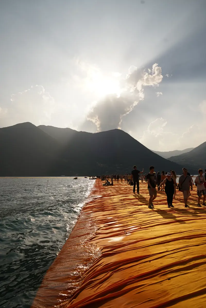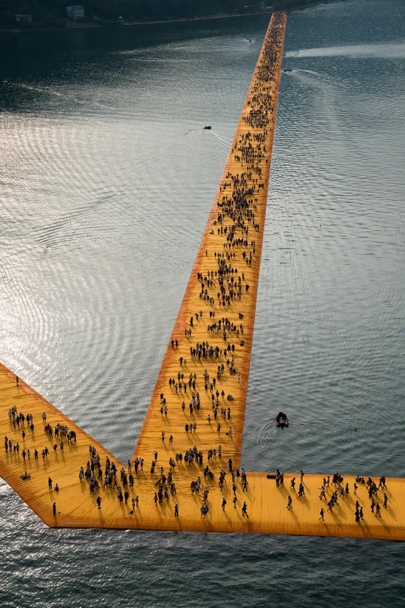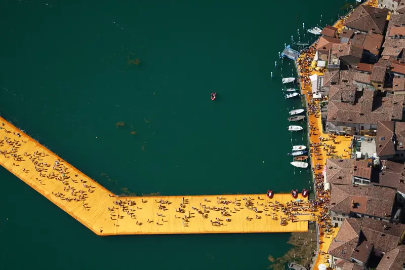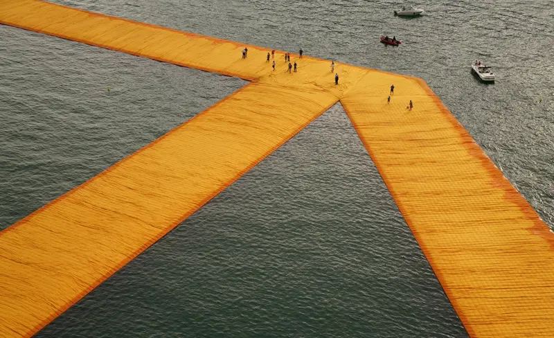 2016 yılında, 16 gün boyunca İtalya’nın Iseo Gölü’nün üzerinde parlayarak yüzen sarı kumaşlar yer aldı. Cüretkar ve dikkat çekici tasarımlarıyla her zaman mekana ve kente olan bakışımızı değiştirmeyi başaran Christo & Jeanne Claude ikilisi, “The Floating Piers (Yüzen İskeleler)” başlığını taşıyan üretimleriyle ziyaretçileri suyun üzerinde yürümeye davet ediyor. 22 bin adet yüksek yoğunluklu poliüretan küp üzerine 100 bin metrekare kumaş kaplanarak oluşturulan yüzeyler, suyun dalgalarıyla hareket ediyor. Tasarım, hem dikkat çekici bir kentsel arayüz, hem de coğrafyanın bir uzantısı haline gelerek ziyaretçilerine benzersiz bir duyusal ve mekansal deneyim sunuyor. Christo, tasarımla ilgili “Tıpkı tüm tasarımlarımızda olduğu gibi, The Floating Piers da kesinlikle halka açık ve ücretsizdi. Bilet yoktu, açılış yoktu, rezervasyon yoktu, sahipler yoktu. The Floating Piers, sokağın bir uzantısıydı ve herkese aitti.” diyor.