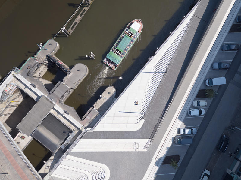 2006 yılında yapılan denetimlerde mevcut yapının taşıyıcı elemanlarının zorlandığı ve temellerin güçlendirilmesi gerektiği tespit edilince, Hamburg Belediyesi yeni bir tasarım yarışması düzenlemiş ve projeyi Zaha Hadid Architects üstlenmiş. Şehrin simgesel alanlarından biri olan bu kıyı bandı, hem güçlü bir sel savunması hem de Elbe Nehri ve limana kesintisiz manzaralar sunan kamusal bir promenad işlevi görüyor. Nehir kıyısı promenadı, farklı mekansal niteliklere sahip iki bölüme ayrılmış. Batıdaki bölüm daha geniş ölçekli ve nehir boyunca gemi trafiğini izlemeye olanak tanıyan panoramik manzaralar sunuyor. Doğudaki bölüm ise limanın marinası sayesinde daha samimi bir atmosfere sahip; amfitiyatroya paralel uzanan uzun bir rampa, ziyaretçileri su kenarına doğru yönlendiriyor.
