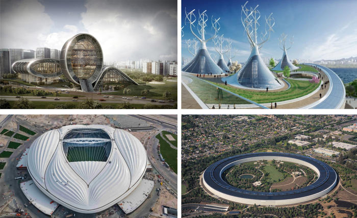 Resim 3, 4. Google’da “future architecture” ve “gelecek mimarlık” aramalarında ilk çıkan imajlar; Resim 5. Al Wakrah Stadyumu, Zaha Hadid Architects (ZHA); Resim 6. Apple Genel Merkezi, Foster + Partners.