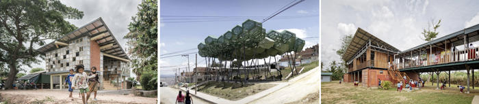 Hem mimarlığın belki de insanlığın geleceği için umutlu olmamızı sağladığı projeler de var. Maceracı Küresel Okul, çevresindeki köy ile ortak kullanım alanları oluşturuyor; iklime uygun açık ve yarı açık mekanlar yaratıyor; çok basit malzemeleri kullanarak geliştirdiği strüktür sistemi aynı zamanda depolama ve oyun alanı olarak farklı şekillerde değiştirilerek kullanılabiliyor. Sadece okulu kullanan öğrencilere hizmet etmeyi değil, hemen yanındaki koyun sosyal merkezi olmayı amaçlıyor. Umut Ormanı Bogota, uçsuz bucaksız gecekondu mahallelerinden şöhreti en kötü olanlardan birisi olan Altos de Cazuca’da yer alıyor. Sadece altındaki açık alana burada gerçekleşen çeşitli aktiviteler sırasında gölge yapmayı amaçlıyor gibi görünen yapı, oldukça basit bir sisteme sahip. On iki yüzeyli kutuların bir araya gelmesi ile oluşan örtü, altında kamusal bir alan tanımladığı gibi şehrin en aza sahip olan kişilerin yaşadığı mahallede rengi, dokusu ve basitliğine rağmen iddialı tasarımı ile bir işaret oluşturuyor. Etania Okulu, bölgedeki Endonezyalı göçmen işçilerin hukuki statüleri nedeniyle eğitimden yararlanamayan çocukları için tasarlanmış. Konumunun sel baskınına açık olması nedeniyle yapı zeminden yükseltilmiş; yarı açık kullanım mekanlarının tamamı üst kotta bulunuyor. Havalandırma sağlayan yarı açık sistem aynı zamanda küçük çocukların kendilerini daha rahat hissetmeleri için düşünülmüş.