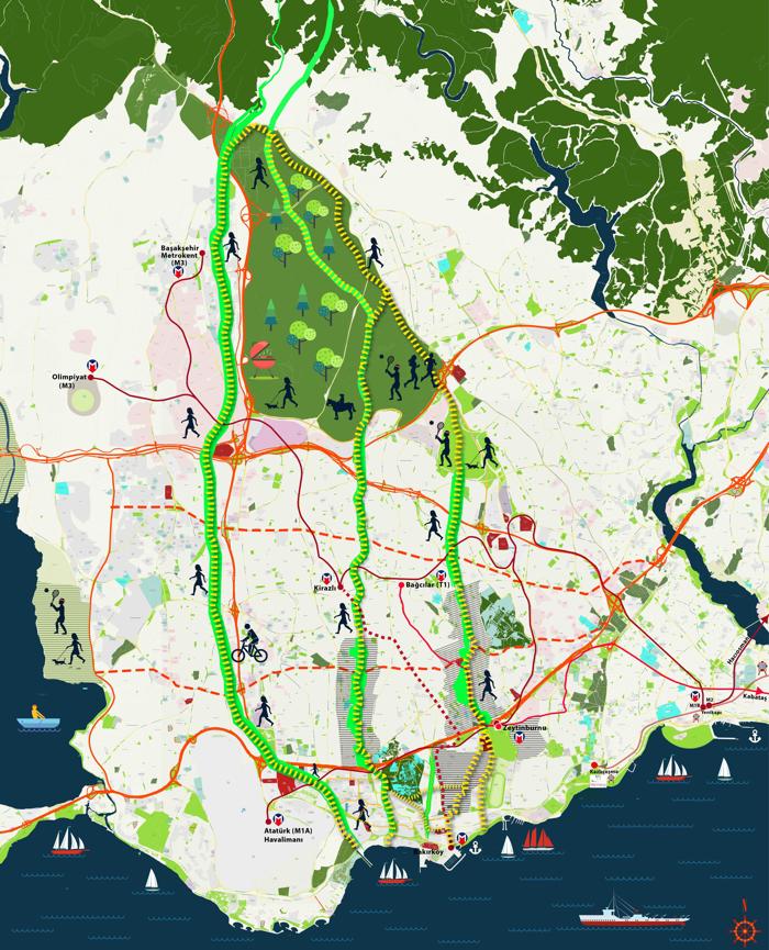 Şekil 1. İstanbul’un batısındaki çökme riski taşıyan yapıların yoğunlaştığı alüvyonlar, Marmara Denizi’ni kuzeydeki ormanlık alanlara bağlayan yeşil akslar yaratma potansiyeli taşımakta. Bu yeşil akslar yakın bölgenin yerinde dönüşümünü önemli ölçüde hızlandırabilir.