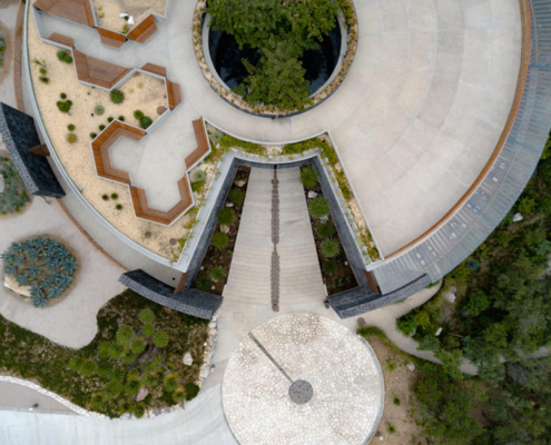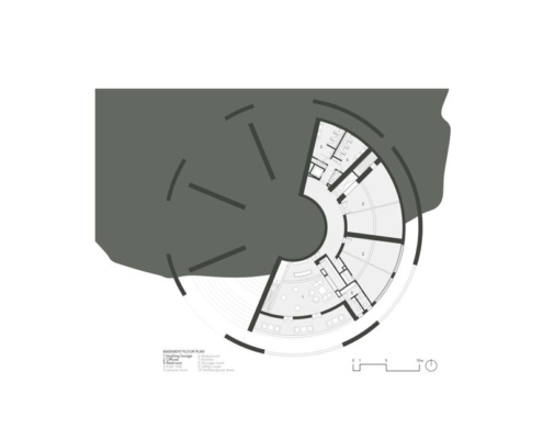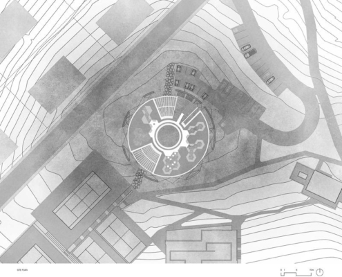Tasarım, ortasında yansıtma havuzu bulunan merkezi bir boşluğu çevreleyen eş merkezli halkalar üzerinden kurgulanmış. Eğimli araziden yükselen ve yerel taştan inşa edilen dış halka, programın büyük bölümünü taşıyan platformu destekliyor ve yapının bir kısmının doğal eğime gömülmesine olanak veriyor.