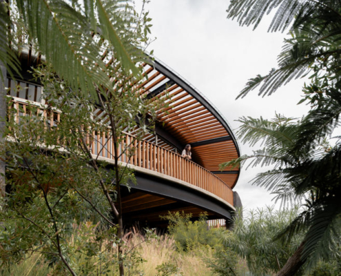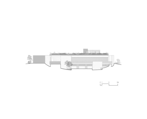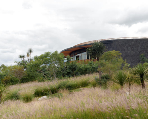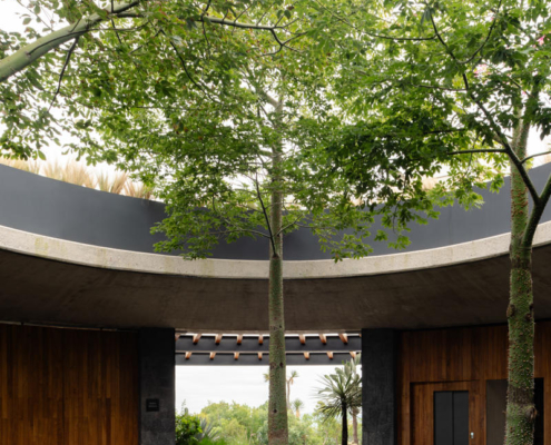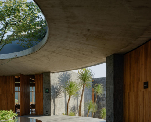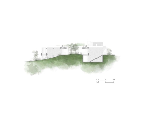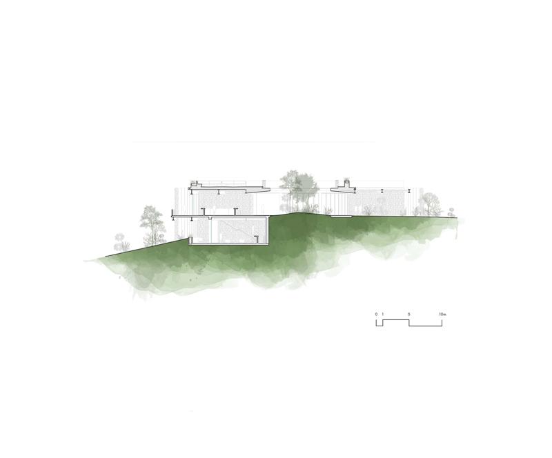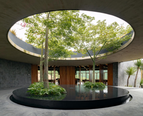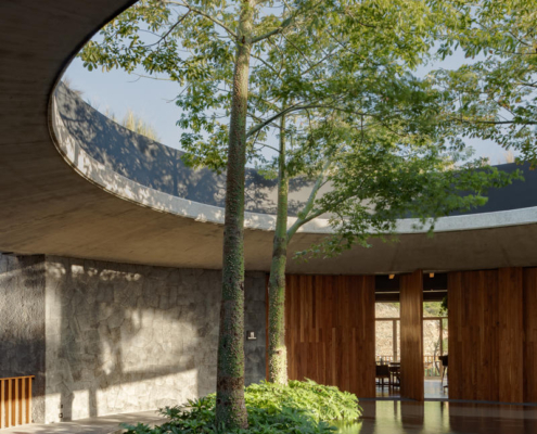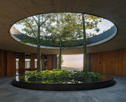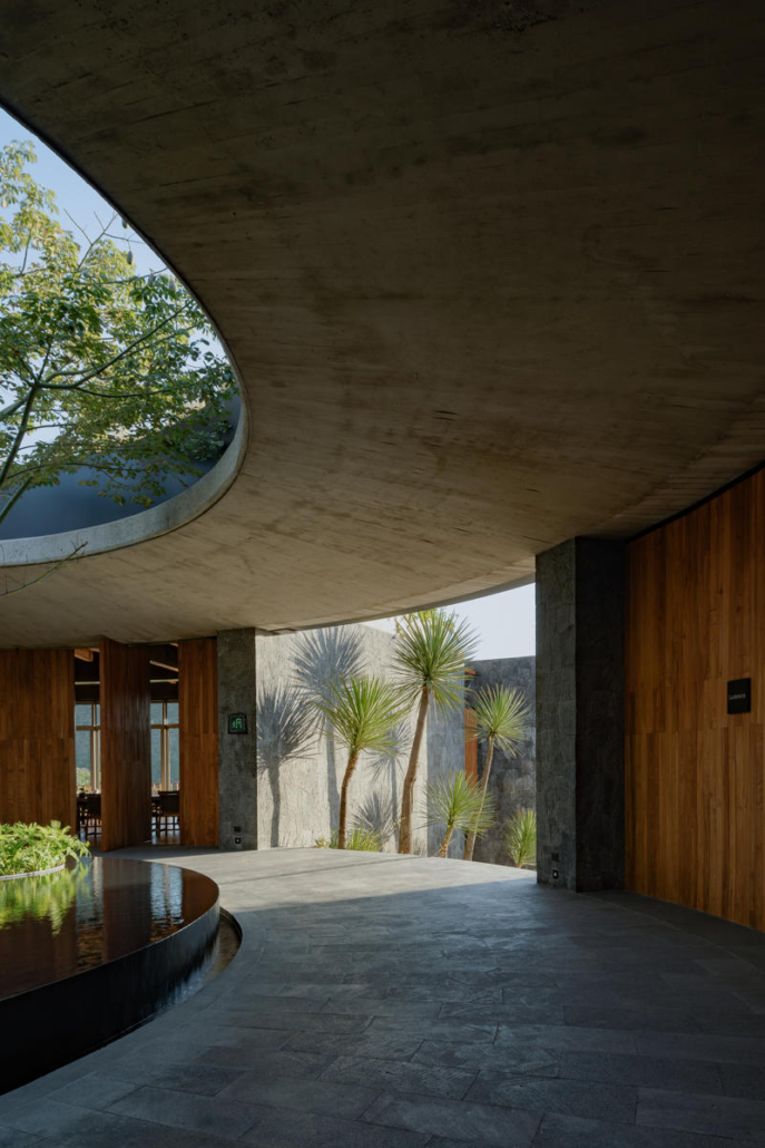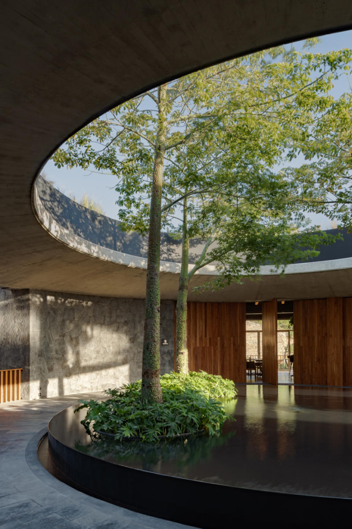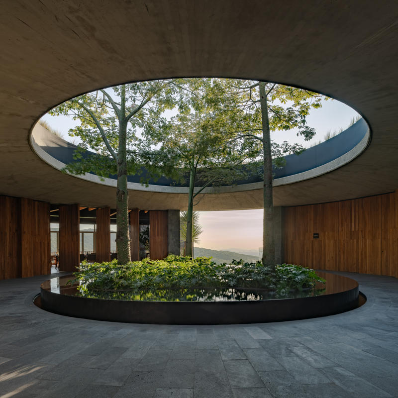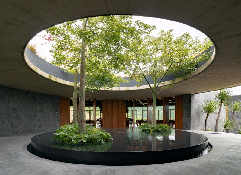Yapının merkezindeki beton döşemeye açılmış büyük bir okülüs (daire biçimli açıklık), yükselen peyzaj unsurlarını çerçeveleyerek yapının çevreyle kurduğu ilişkiyi vurguluyor. Tasarımın temel yaklaşımı, doğal bağlama uyum sağlayan ölçekte kalmak ve zamanla zarif biçimde yaşlanan malzemeler kullanmak üzerine kurulmuş.