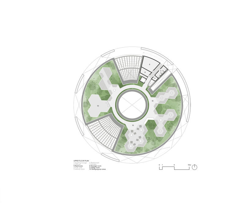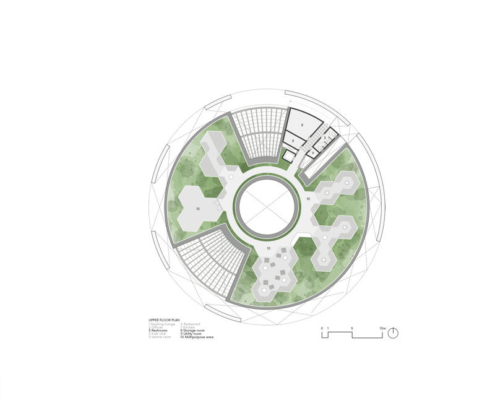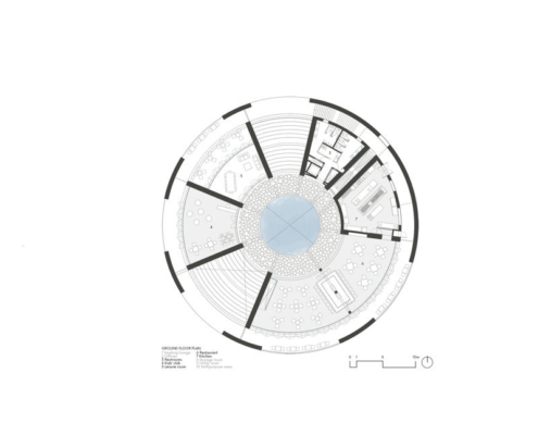 Program zemin ve kısmen bodrum katlarında çözümlenirken, çatı döşemesi 360 derecelik manzaraya sahip seyir terası ve geçici etkinliklere uygun çok amaçlı bir alan olarak düzenlenmiş. Dış ve ikinci halka arasındaki koridor balkon ve servis alanı işlevi görüyor. İkinci halka, cam cephe sayesinde iç mekanı çevredeki manzarayla birleştirirken doğal ışığı da en üst düzeye çıkarıyor. En içteki üçüncü halka ise döner ahşap kapılardan oluşuyor ve mekânların dışa açıklık derecesi ihtiyaca göre ayarlanabiliyor.