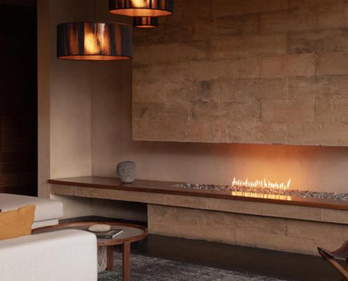 LL Evi, yakınında konumlandığı dağın doğal bir uzantısı gibi yükseliyor. Ev, hem birbirine bağlanan hem de ayrışan parçalı prizmalardan oluşuyor. Bu prizmatik düzenleme, kimi zaman iç mekanlarda açıklıklar yaratıyor; kimi zaman da geri çekilerek mahremiyet sağlayan alanlar kuruyor. İri ve koyu renkli beton bloklardan oluşan tektonik düzen cepheye dair algıyı şekillendiriyor. Bu bloklar sayesinde yapı, girinti ve çıkıntılarla kadim taş kütlelerini andıran bir karakter kazanıyor. Otopark alanı da bu hareketlerle, kütlelerin birinin içinde dikkat çekmeyecek şekilde konumlandırılmış.